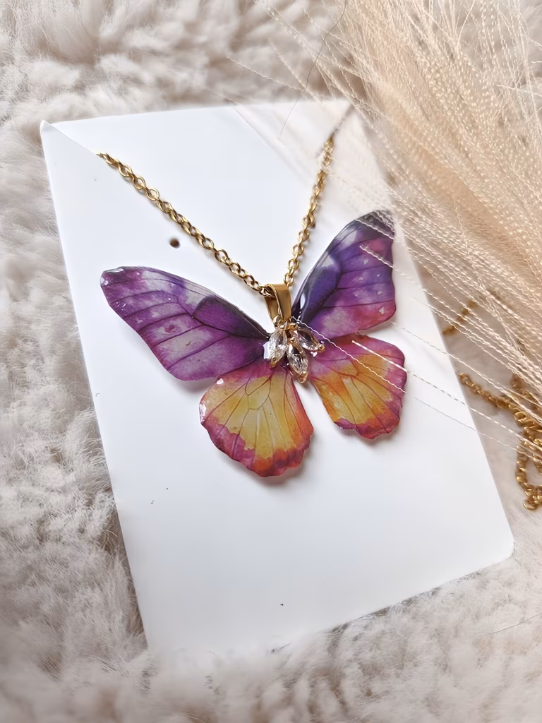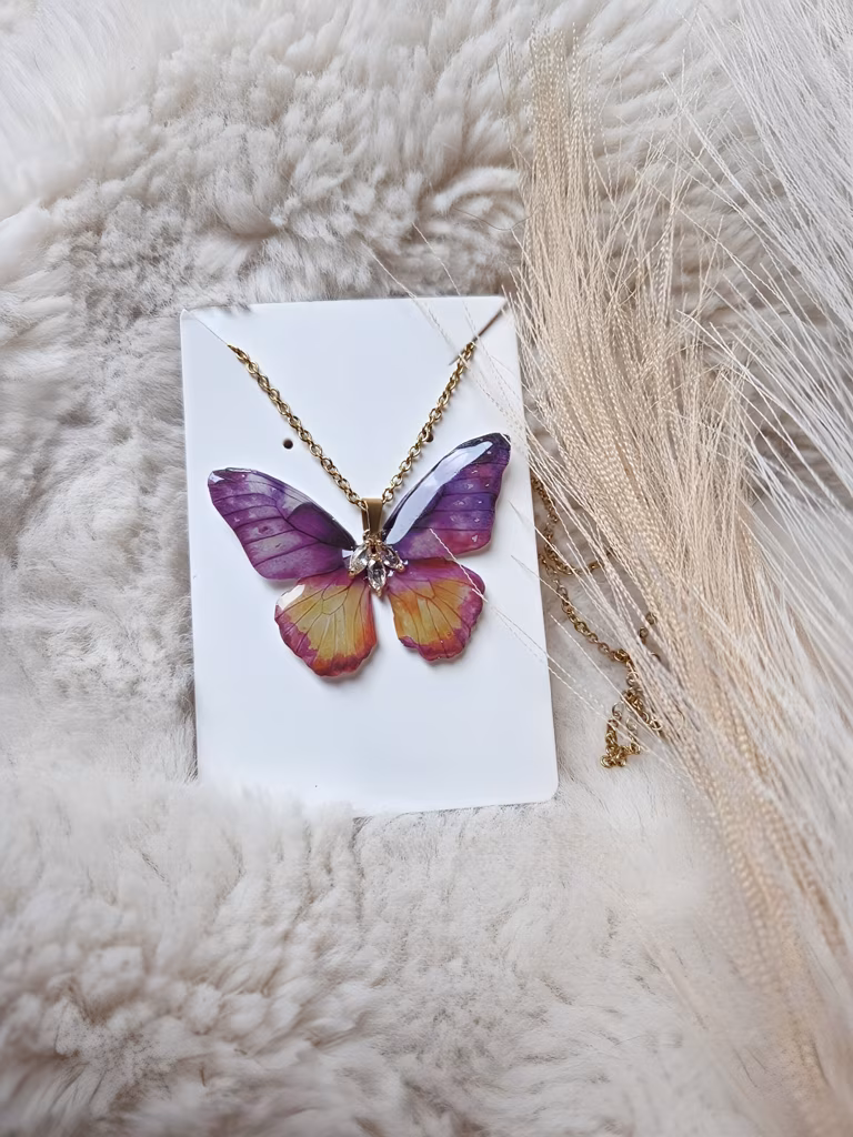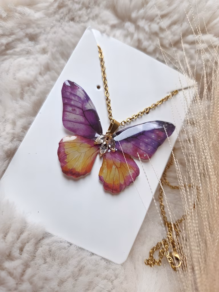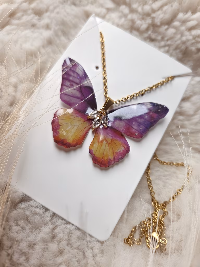 Łańcuszek: 45 cm stal chirurgiczna, środek motylka miedź pozłacana 18k złotem. Wymiar zawieszki: 5x4 cm, utwardzona żywią UV.