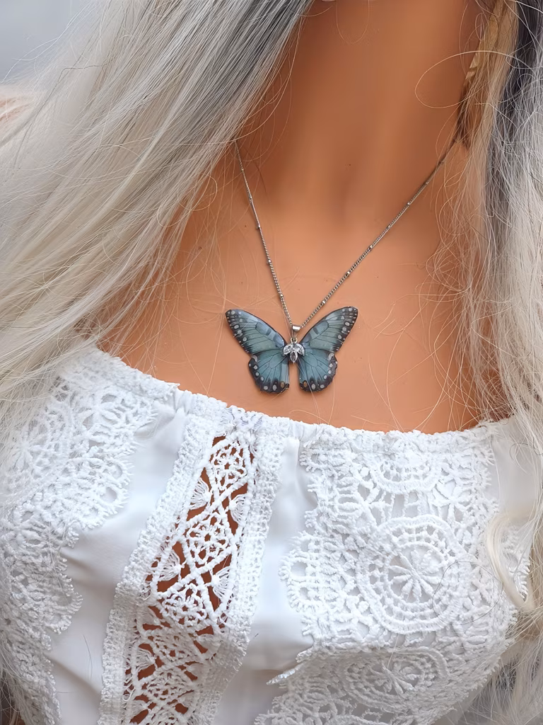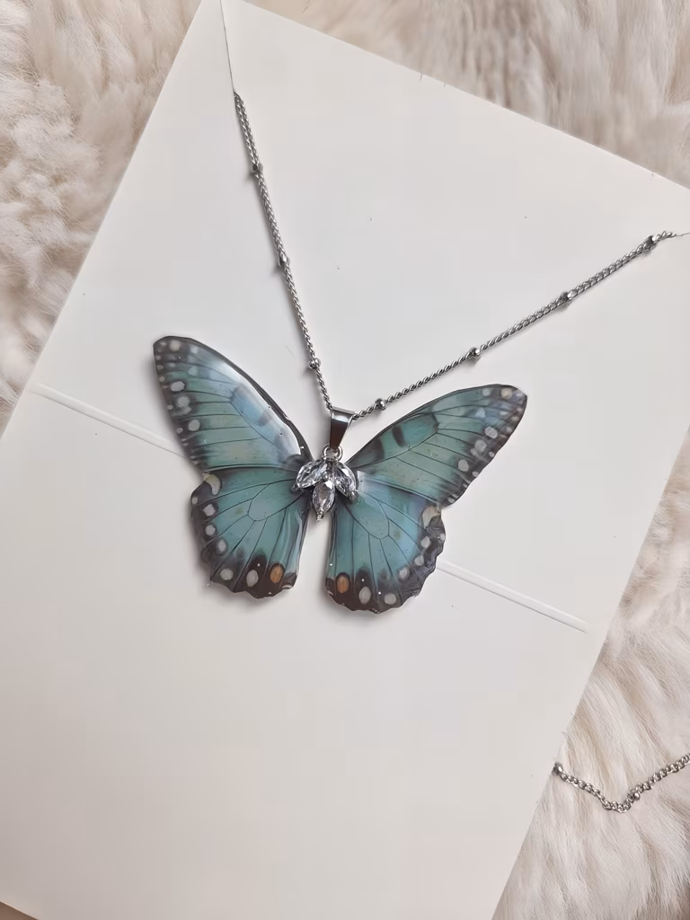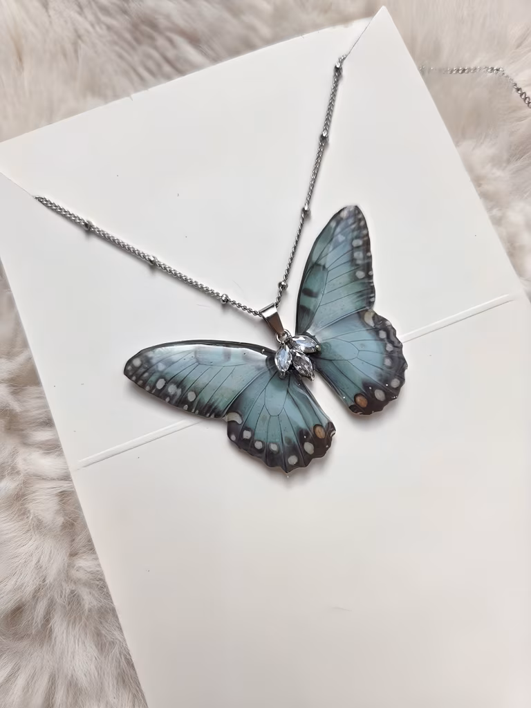 Łańcuszek: 45 cm stal chirurgiczna, środek motylka miedź posrebrzana. Wymiar zawieszki: 5,5x3,8 cm, utwardzona żywica UV.