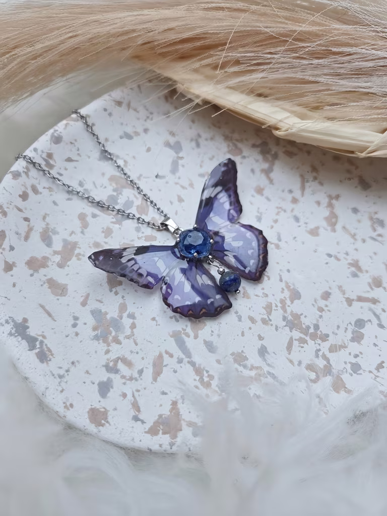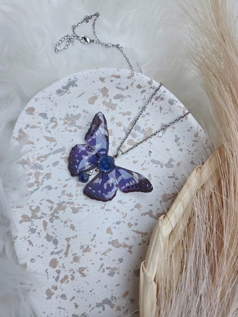 Atramira to motylka o skrzydłach tak głębokich jak tusz nocnego atramentu. Jej białe wstawki przypominają rozbłyski gwiazd, a serce — symboliczne i duchowe — skrywa kamień Lapis Lazuli, święty kamień prawdy, odwagi i wewnętrznej mądrości.