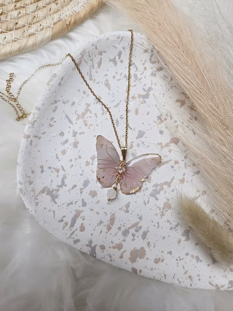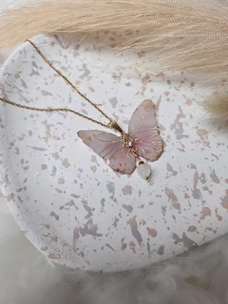 Złóż dłonie z wisiorkiem przy sercu. Wyobraź sobie, że różowy blask i energia motyla łączą się w Twoim sercu, tworząc aurę miłości i harmonii.