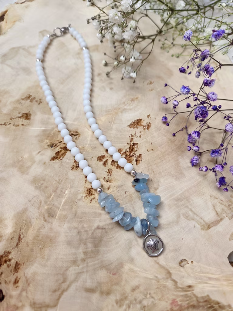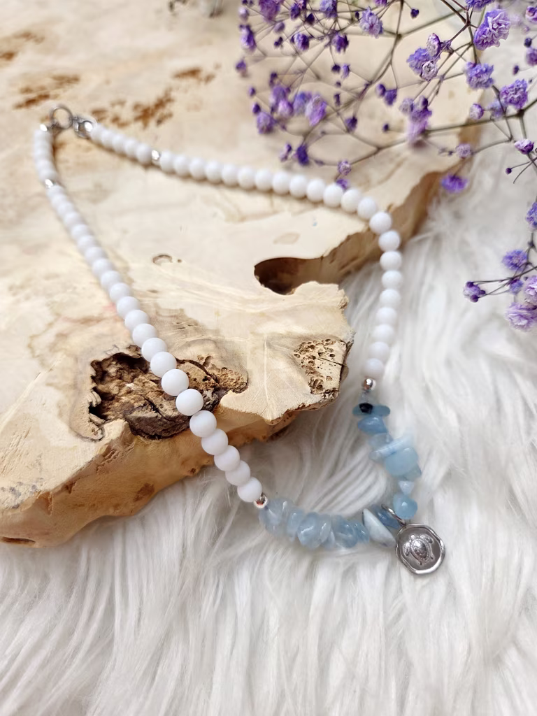 Ten naszyjnik przywołuje wrażenie ciszy nad spokojną taflą wody, gdy niebo odbija się w lustrze jeziora, a delikatne światło poranka rozlewa się po horyzoncie. Jego naturalna, subtelna kolorystyka wprowadza harmonię i spokój, idealnie łącząc delikatność bieli i chłodną świeżość błękitu.