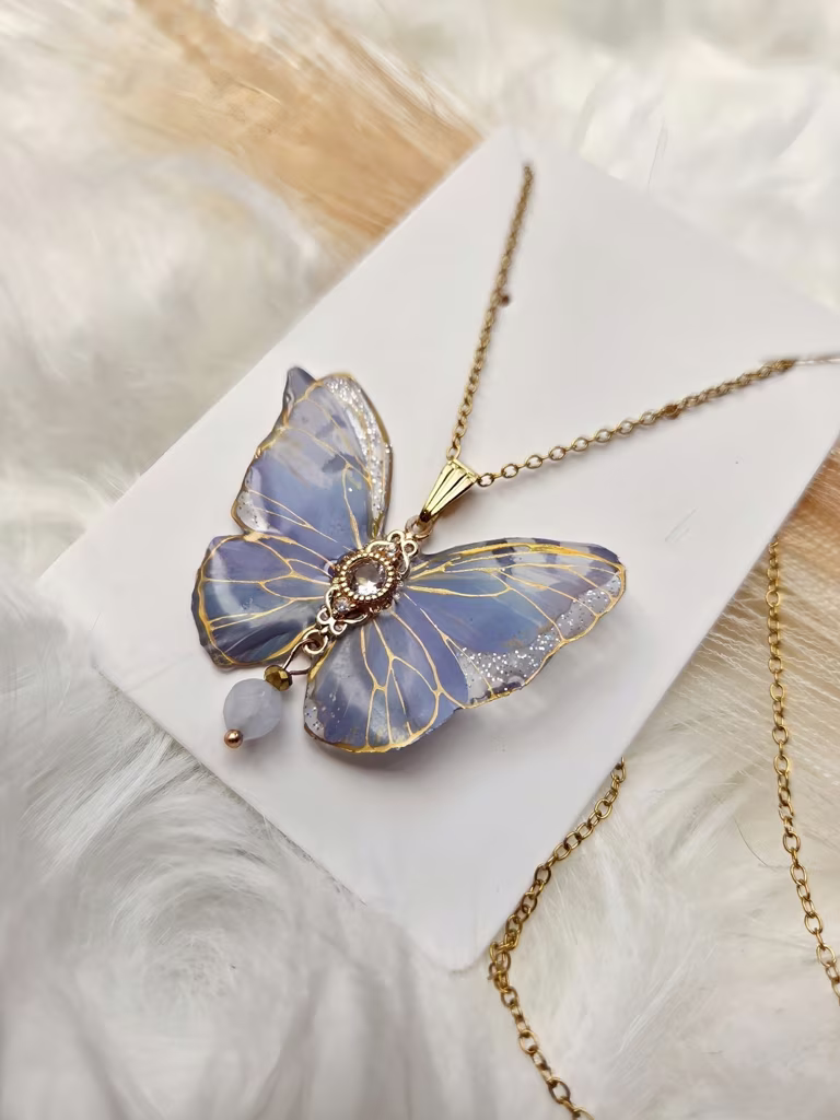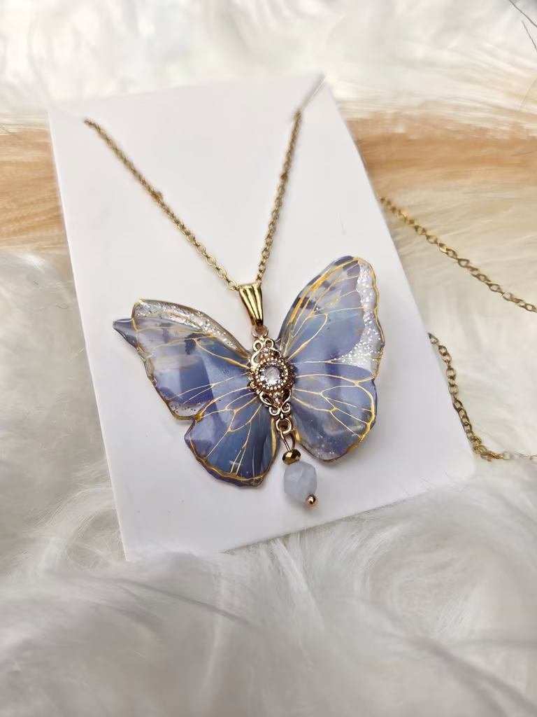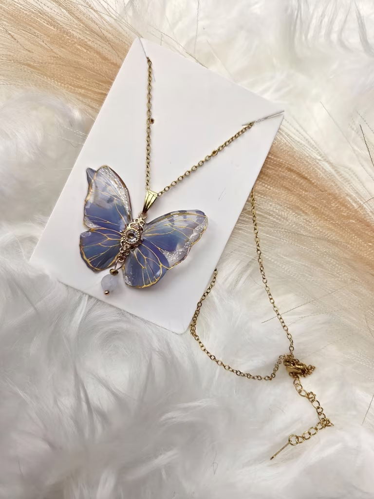 Łańcuszek: 45 cm stal chirurgiczna, środek motylka miedź pozłacana 18k złotem. Wymiar zawieszki: 4,3x4,5 cm, utwardzony żywią UV.