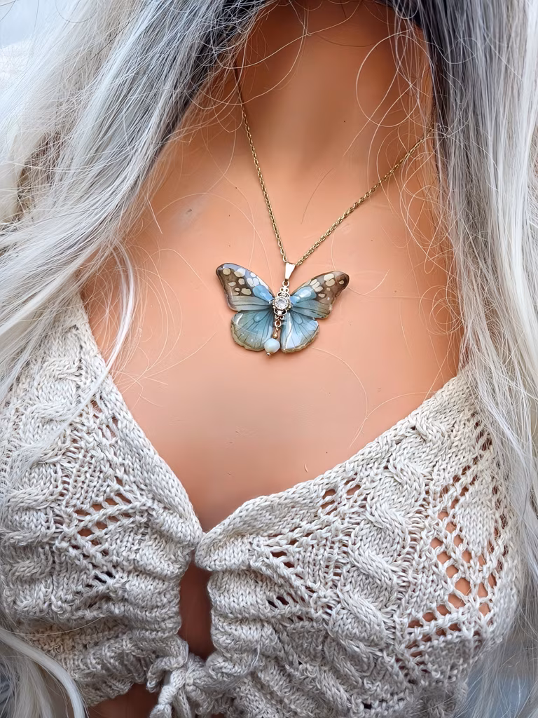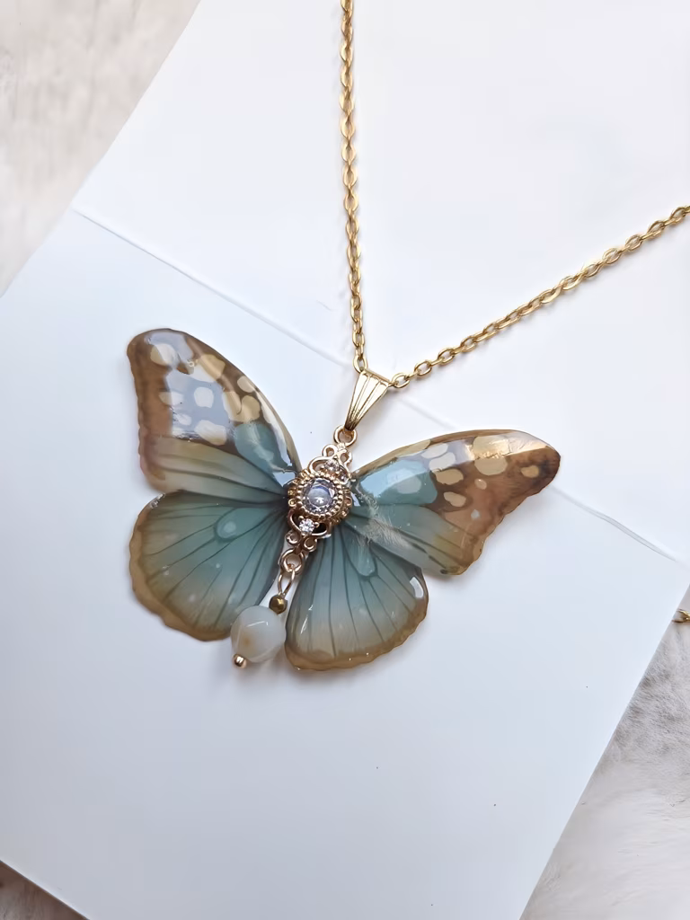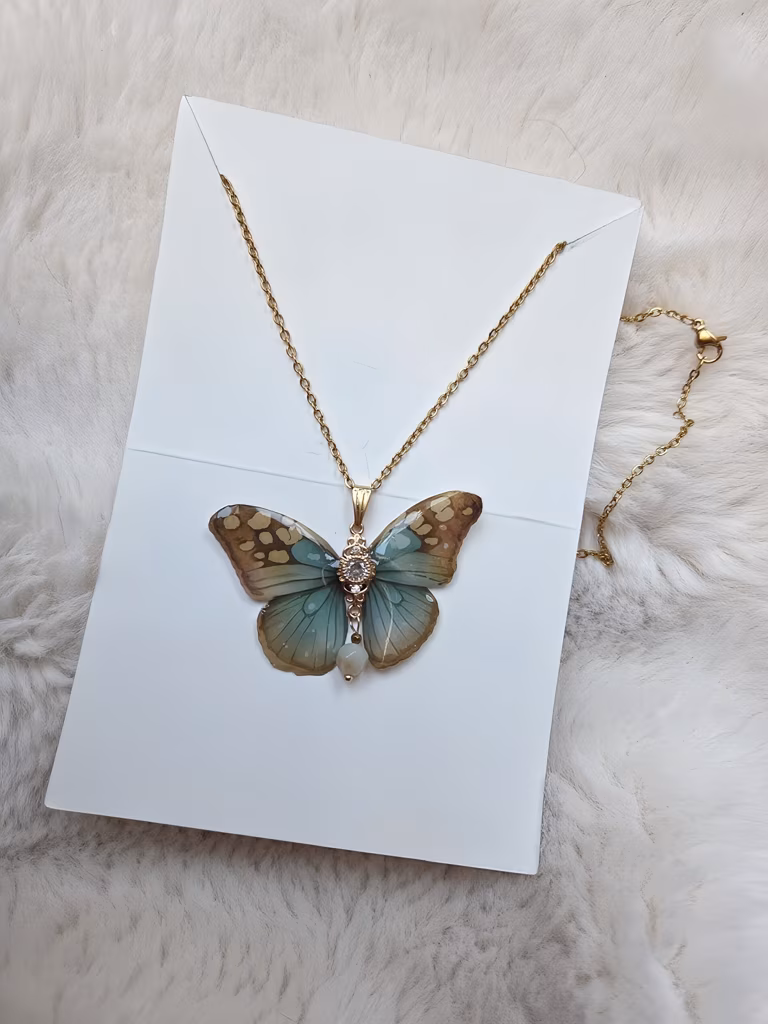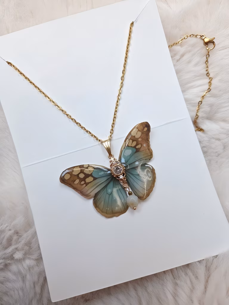 Łańcuszek: 45 cm stal chirurgiczna, środek motylka miedź pozłacana 18k złotem. Wymiar zawieszki: 5,5x3,4 cm, utwardzona żywica, kamień naturalny 6 mm.
