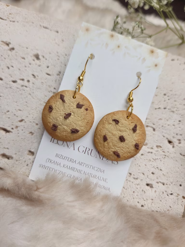 Kolczyki CELINA to ręcznie wykonane, urocze okrągłe ciasteczka z kawałkami czekolady, stworzone z glinki polimerowej. Ich delikatna, złocista barwa i drobne czekoladowe akcenty sprawiają, że wyglądają niemal jak świeżo upieczone smakołyki, gotowe do skosztowania wzrokiem.