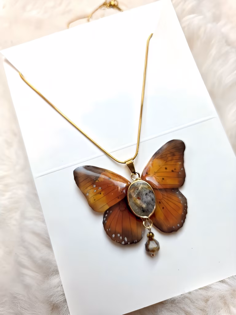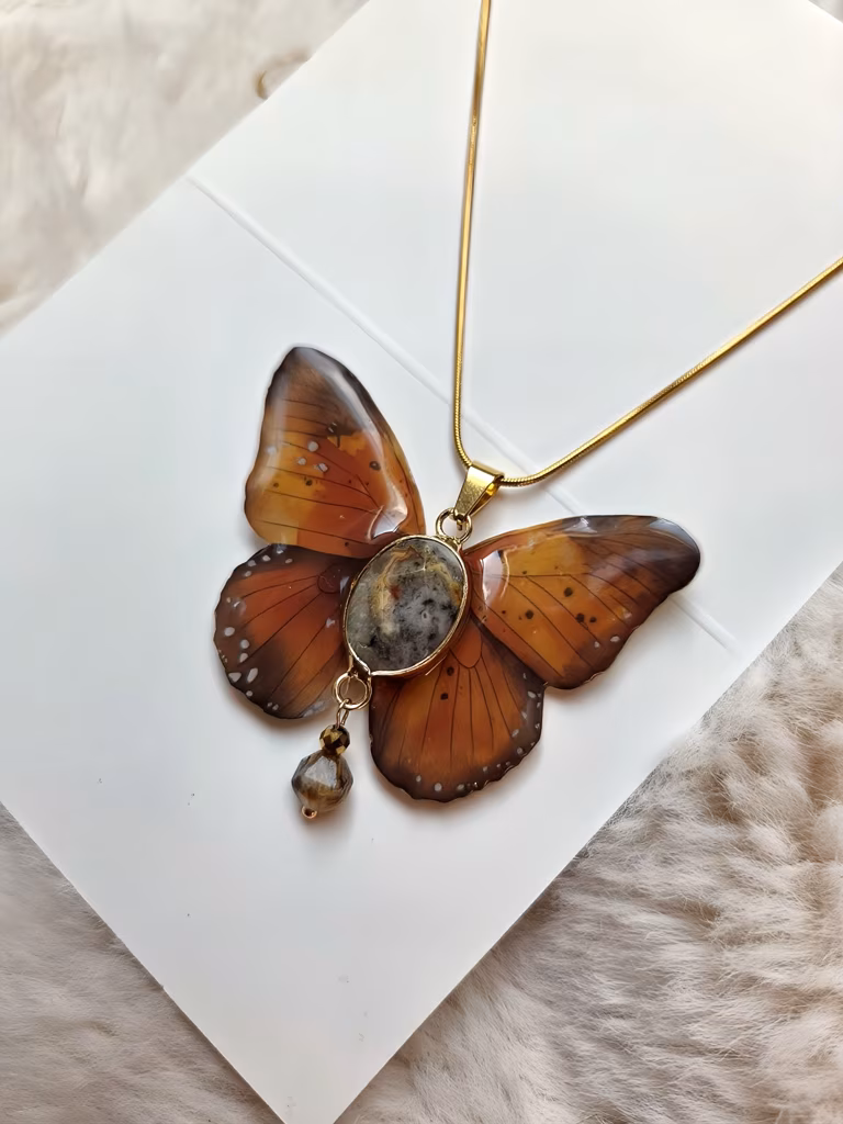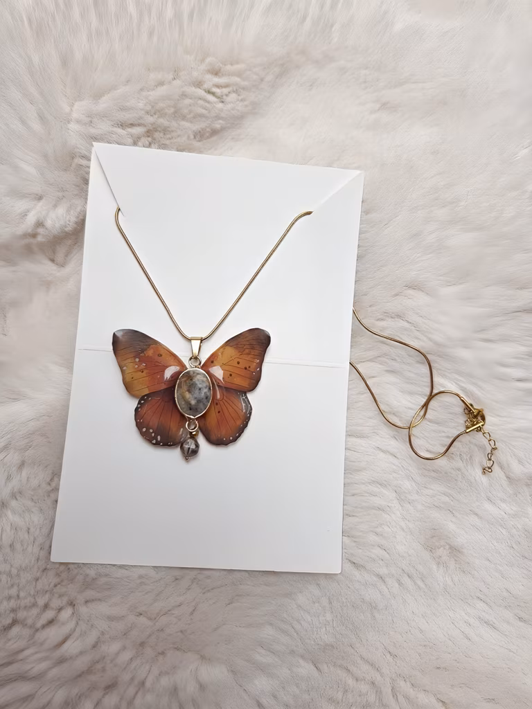 Łańcuszek: 45 cm stal chirurgiczna, środek motylka miedź pozłacana 18k złotem. Wymiar zawieszki: 5,3x4,5 cm, utwardzona żywica, kamień naturalny 6 mm oraz 18 mm.