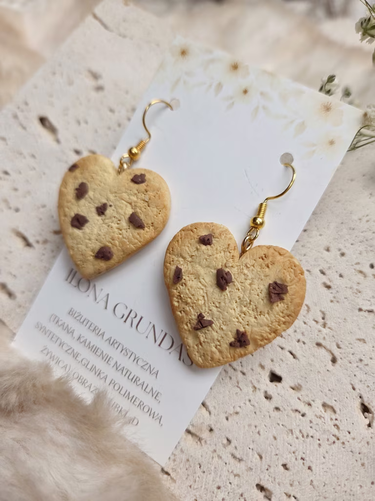 Te kolczyki wyglądają jak małe, świeżo upieczone kruche ciasteczka w kształcie serduszek, które kuszą ciepłym, domowym klimatem i nutą słodkiej fantazji. Ich jasna, „ciasteczkowa” baza ozdobiona jest drobnymi, ciemnymi elementami przypominającymi kawałki czekolady, dzięki czemu całość wygląda niezwykle apetycznie i zabawnie.