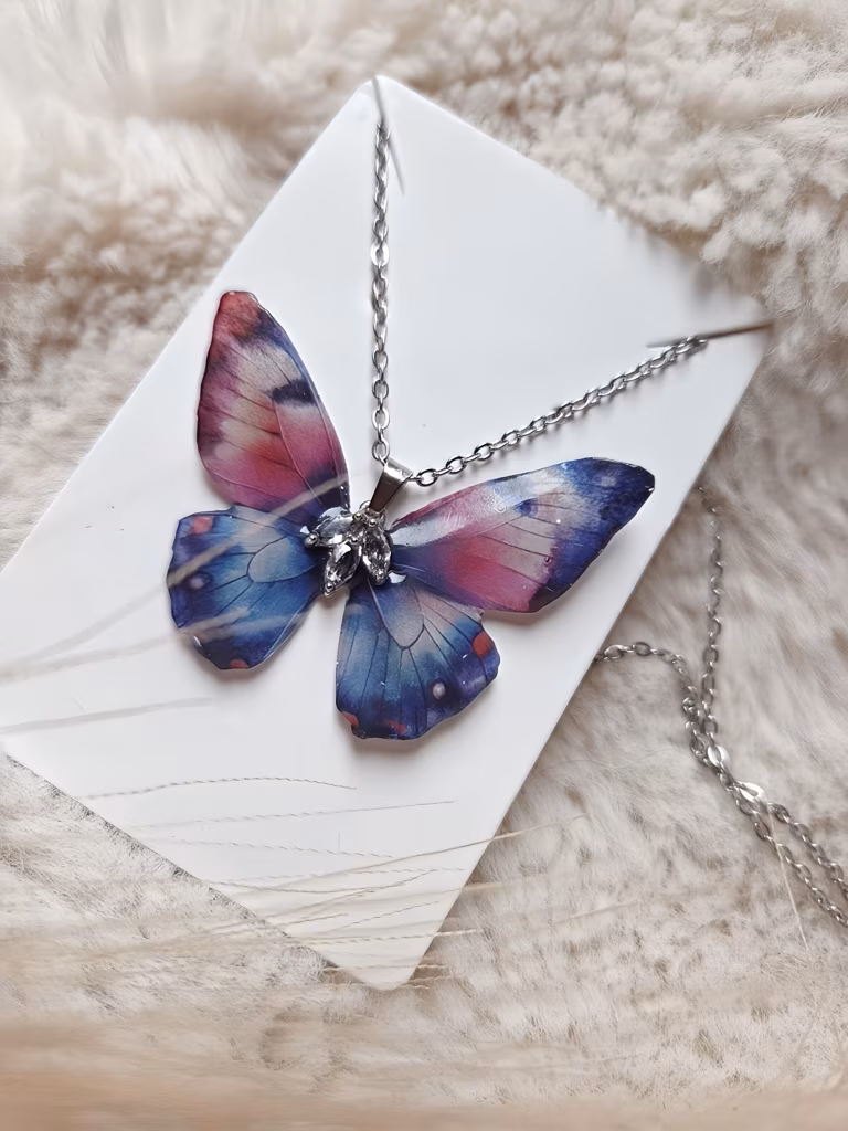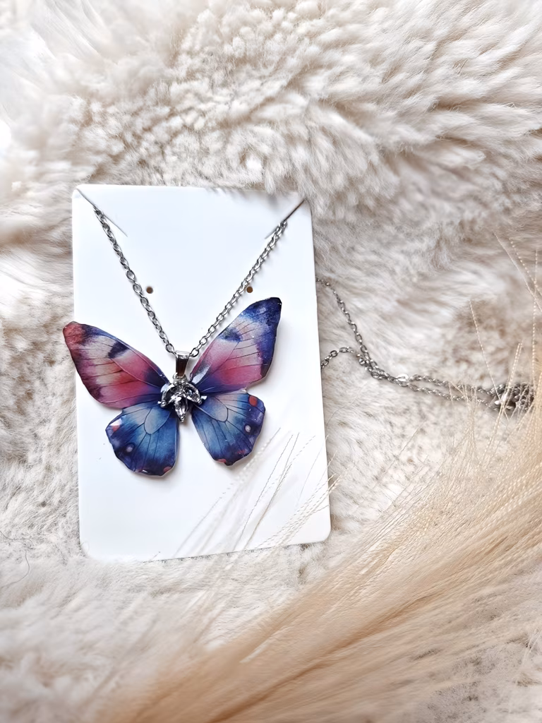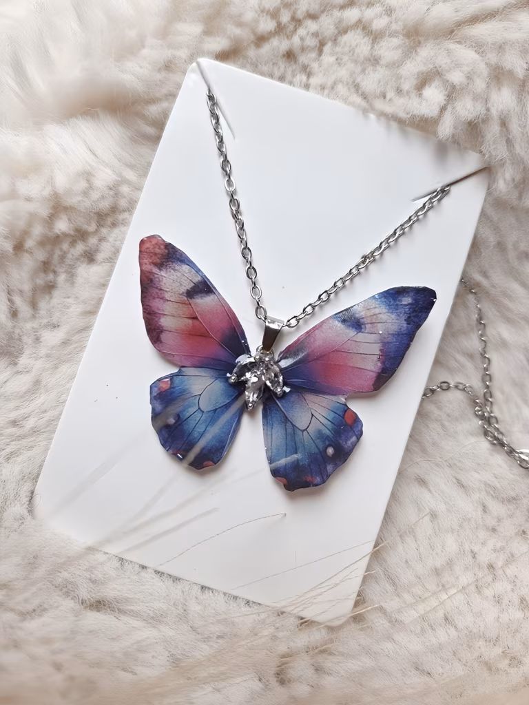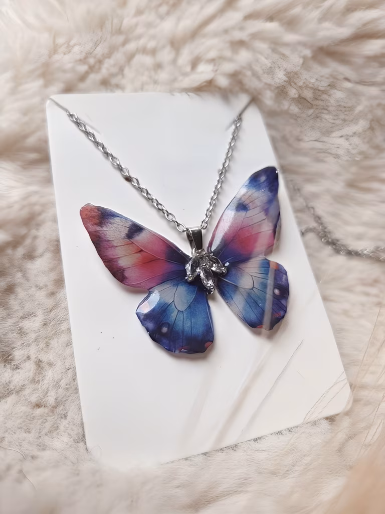 Łańcuszek: 45 cm stal chirurgiczna, środek motylka miedź posrebrzanego. Wymiar zawieszki: 5x4,2 cm, utwardzona żywią UV.