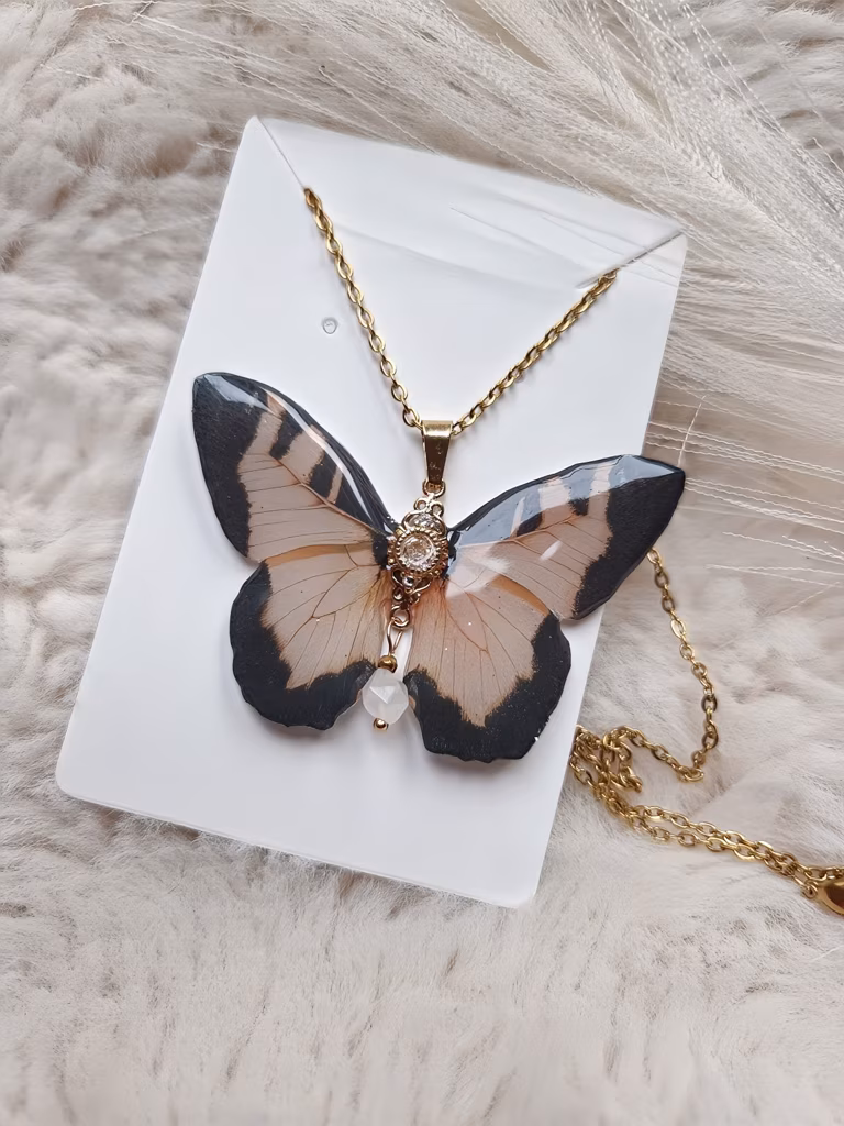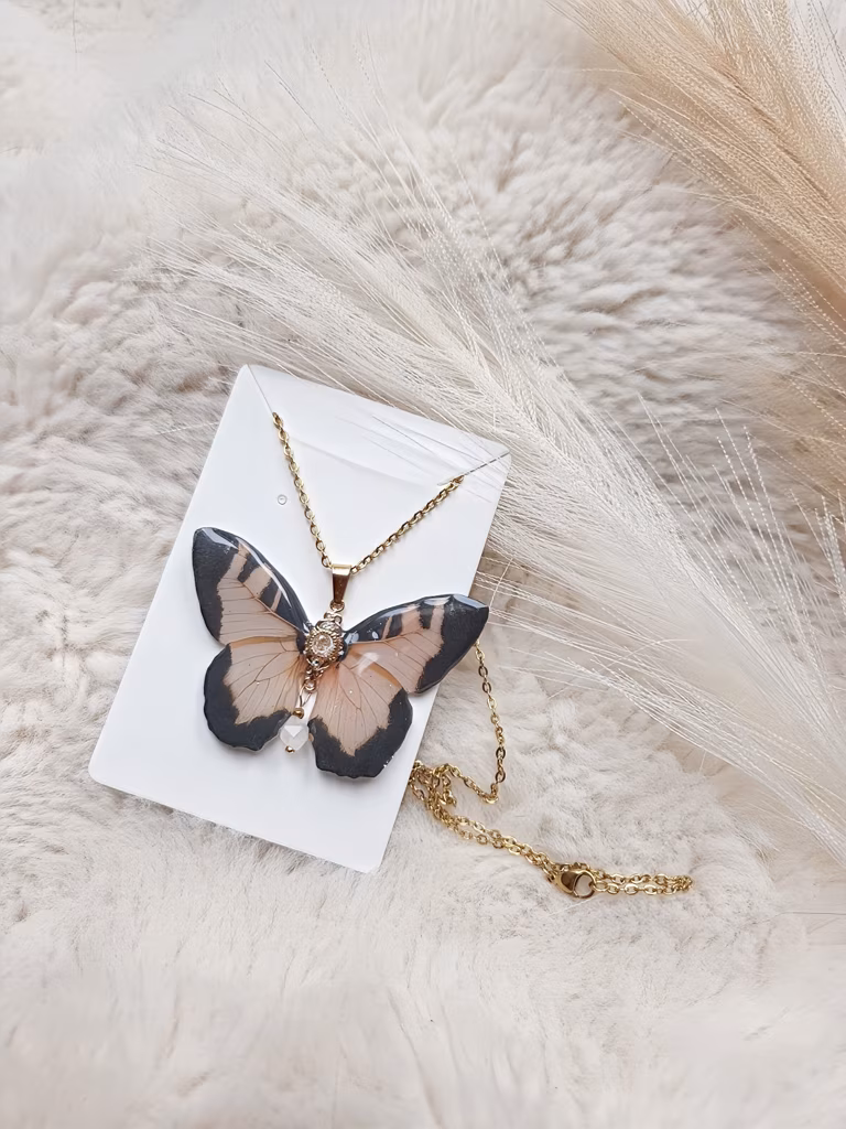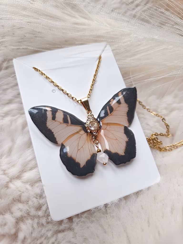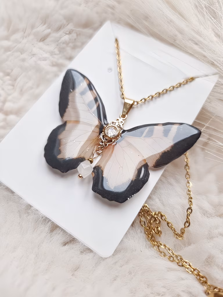 Łańcuszek: 45 cm stal chirurgiczna, środek motylka miedź pozłacaną 18k zlotem. Wymiar zawieszki: 6x4,2 cm, utwardzona żywią UV.