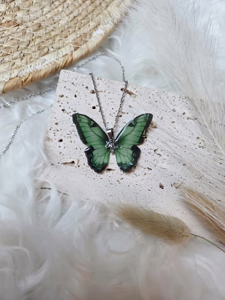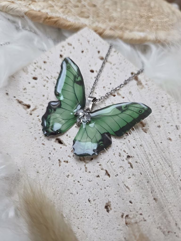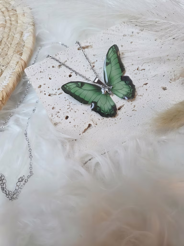 Dotknij listek wisiorkiem — symbolicznie łącząc energię motyla z naturą.