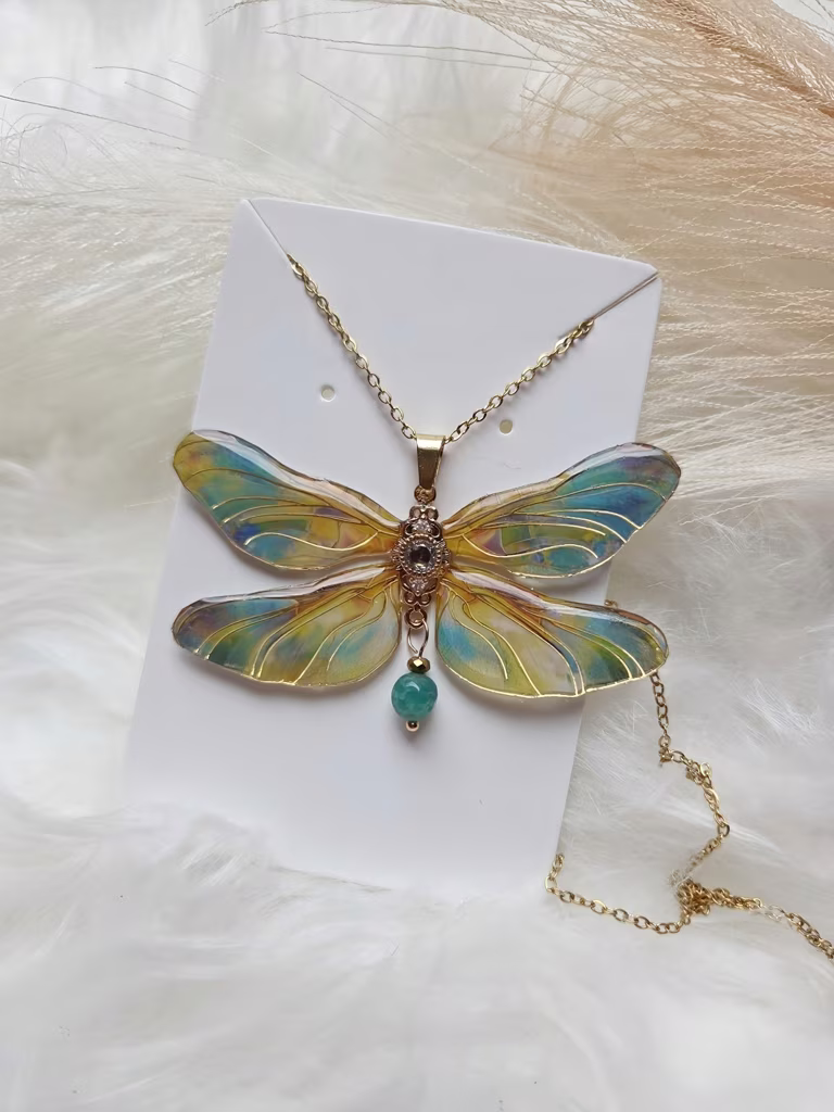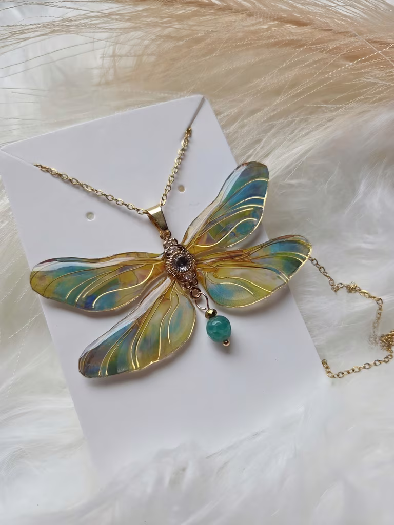 Fluoranya to ważka zrodzona ze światła poranka i czystego nurtu rzeki. Jej skrzydła mienią się barwami wschodzącego słońca i zieleni odbitej w wodzie, a w sercu pulsuje zielony fluoryt — kamień czystości, równowagi i klarownych myśli.