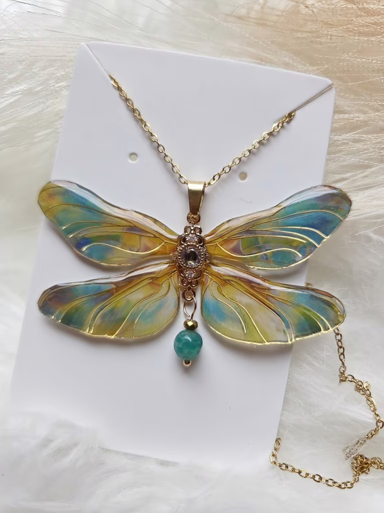 Łańcuszek: 45 cm stal chirurgiczna, środek motylka miedź pozłacana 18k złotem. Wymiar zawieszki: 6,8x4 cm, utwardzony żywią UV.