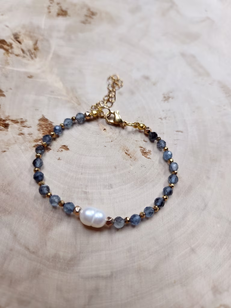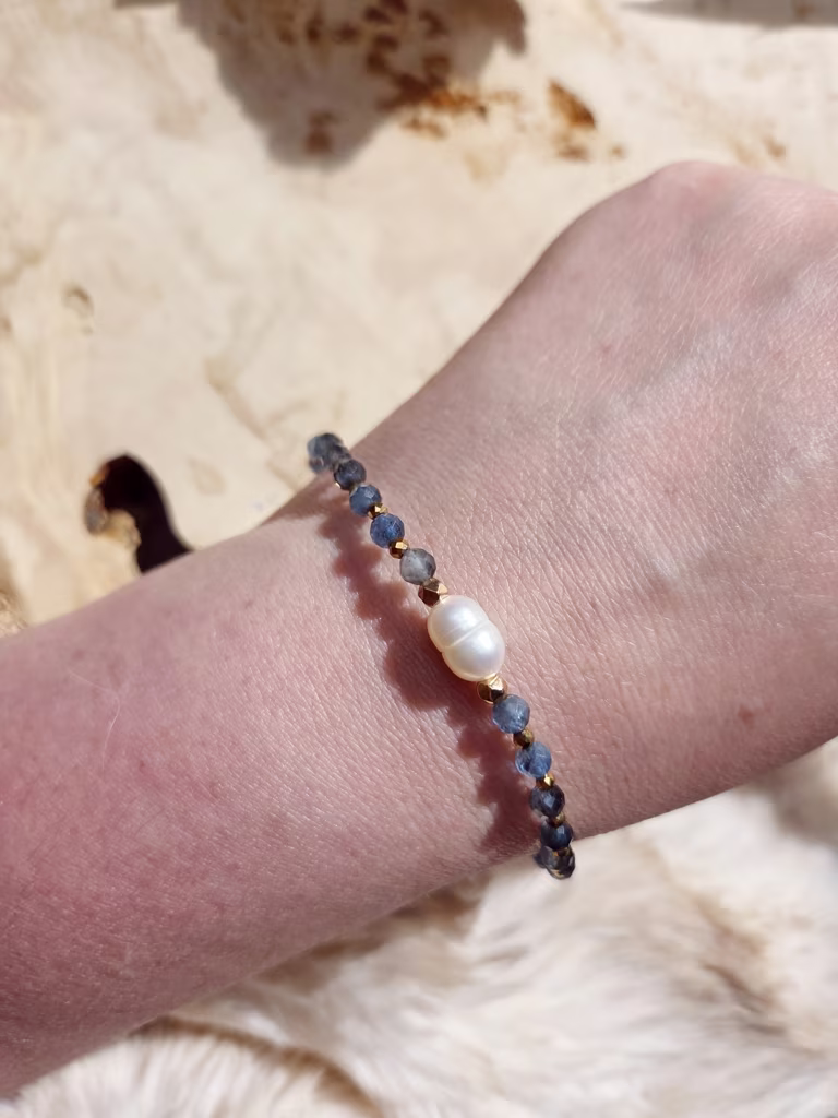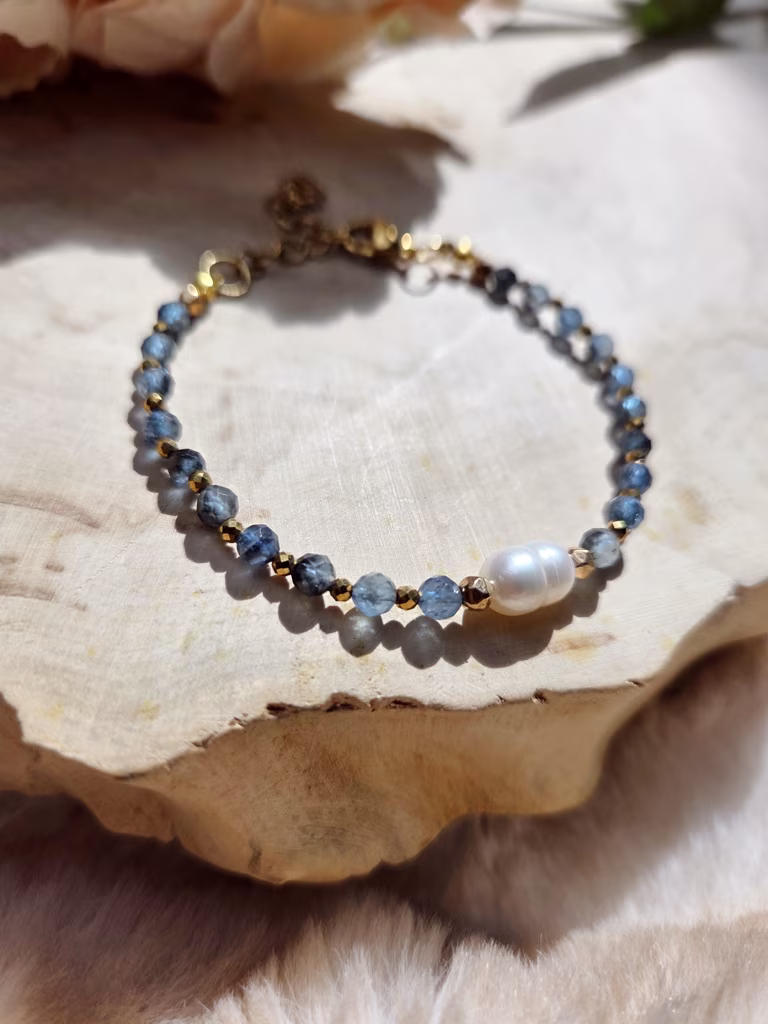 Pomiędzy nimi połyskują drobne, pozłacane elementy hematytu – jak złote iskry słońca odbijające się na powierzchni wody, wprowadzające harmonię, balans i subtelną ochronę. W centrum bransoletki spoczywa perła słodkowodna – delikatna i świetlista, niczym łza księżyca, symbol czystości, intuicji i wewnętrznego ukojenia.