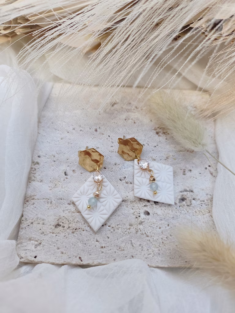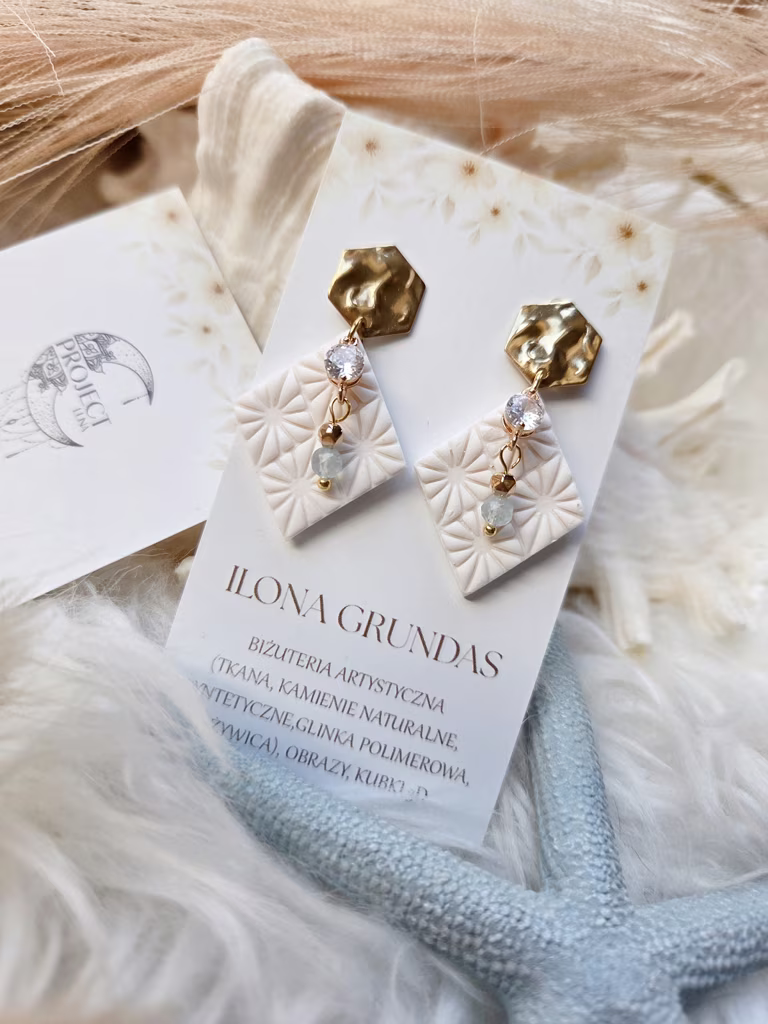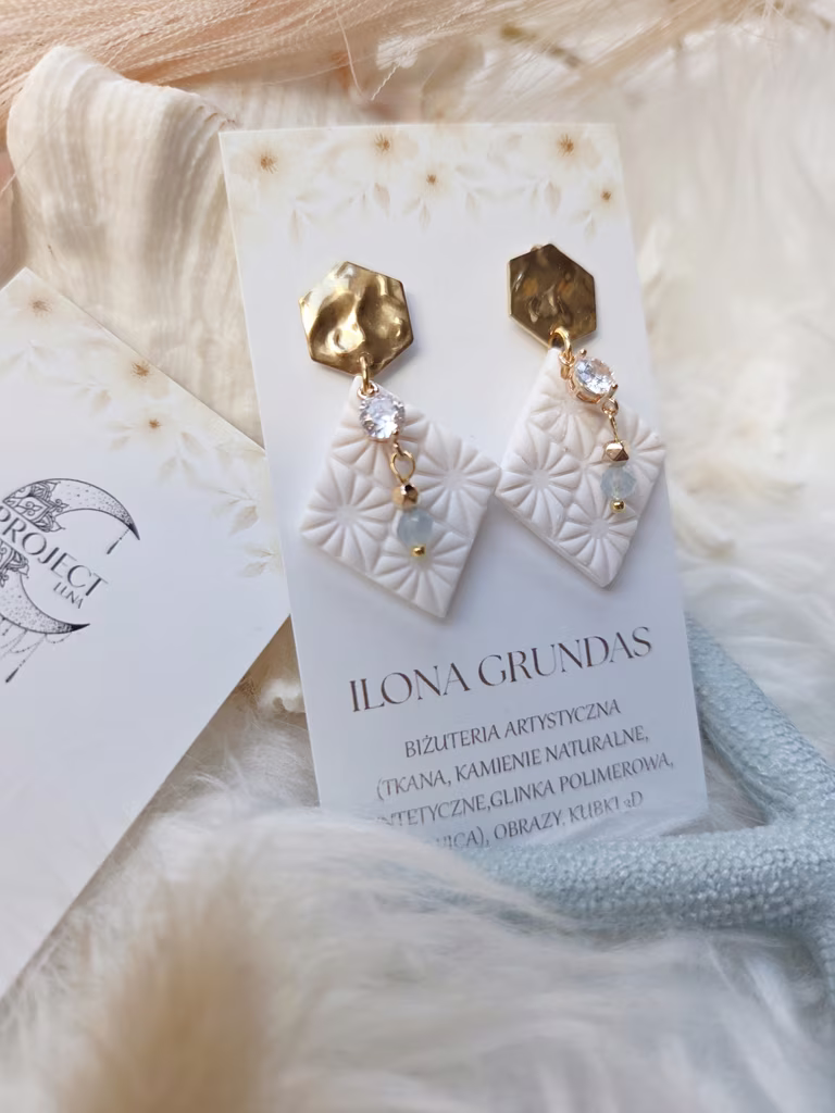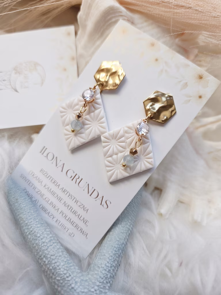 Kolczyki Helia powstały z myślą o świetle — tym miękkim, porannym i ciepłym. Ręcznie wykonane z białej gliny polimerowej zachwycają subtelną formą i lekkością, która pięknie układa się przy uchu. Kamień topazu dodaje im delikatnego blasku, niczym promień słońca zamknięty w biżuterii, a pozłacany hematyt wprowadza elegancki, szlachetny akcent.