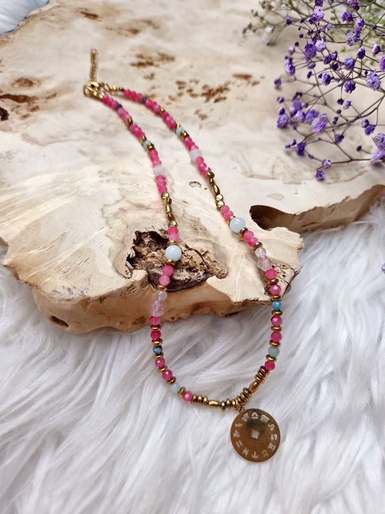 Ten naszyjnik to połączenie ziemskiej harmonii i subtelnej magii gwiazd – jak spacer po różowym zmierzchu, w którym każdy kamień odbija światło w wyjątkowy sposób, a wszechświat zdaje się szepnąć swoje sekrety.
