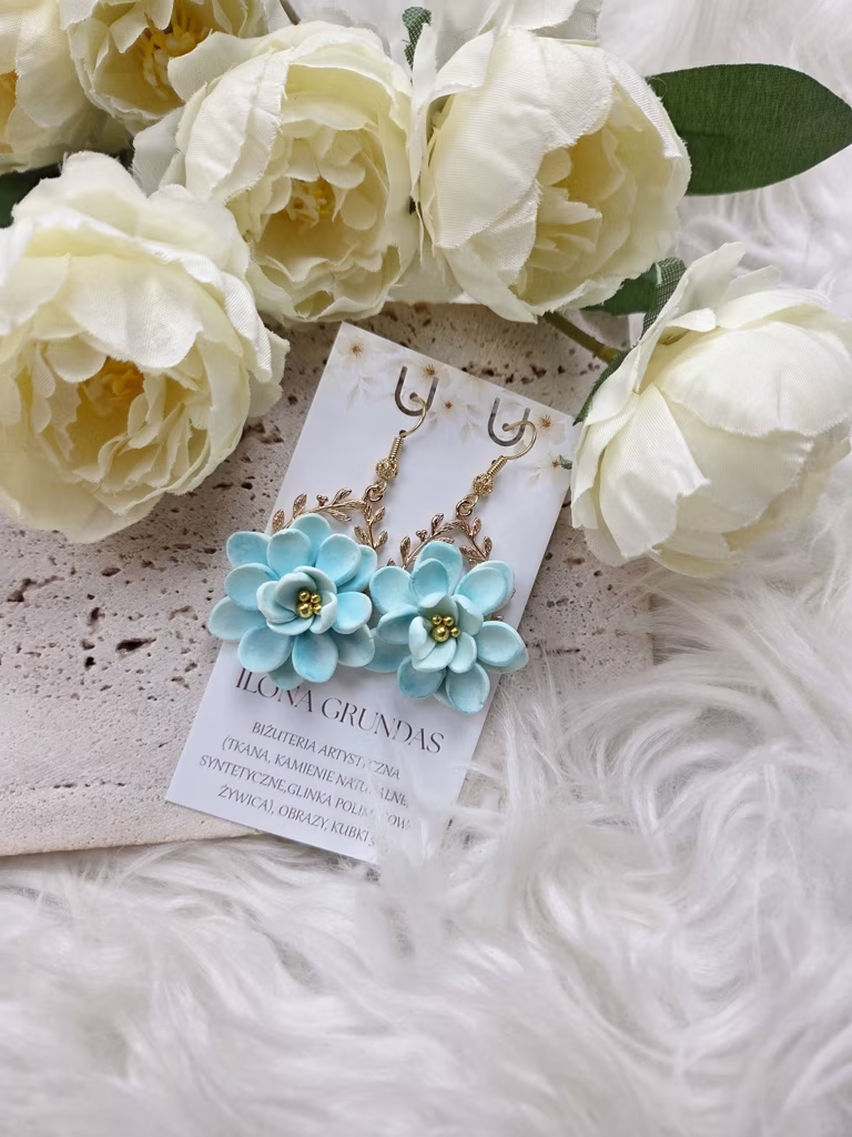 Delikatne i pełne subtelnego uroku kolczyki w kształcie kwiatów, wykonane ręcznie z wysokiej jakości glinki polimerowej. Ich pastelowy turkusowy odcień przywodzi na myśl spokojne, letnie poranki i lekkość natury, dodając stylizacji świeżości i harmonii.