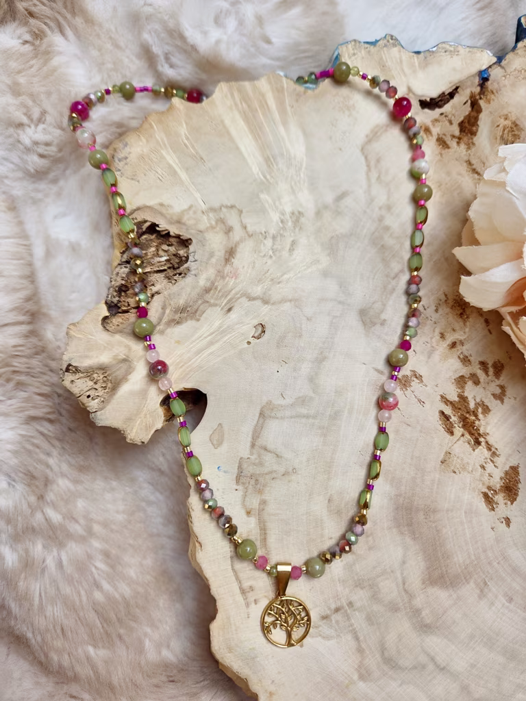 Oliwkowe odcienie przywodzą na myśl leśny spokój i stabilność, różowe zaś otulają serce ciepłem, łagodnością i troską. To naszyjnik, który nie tylko zdobi, ale i niesie ze sobą energię wyciszenia, zakorzenienia oraz delikatnej, uzdrawiającej miłości.