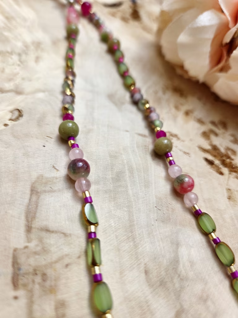 „Leśne Serce” to naszyjnik utkany z barw natury – subtelnych przejść oliwkowej zieleni i ciepłych, pudrowo-różowych tonów, które razem tworzą spokojną, kojącą opowieść o równowadze. Szklane koraliki (także toho ) przeplatają się tu z naturalnymi kamieniami: jadeitem, zielonym jaspisem, kwarcem turmalinowym, oliwinem, kwarcem różowym oraz rubinem– każdy z nich niesie własną energię, lecz razem tworzą harmonijną całość.