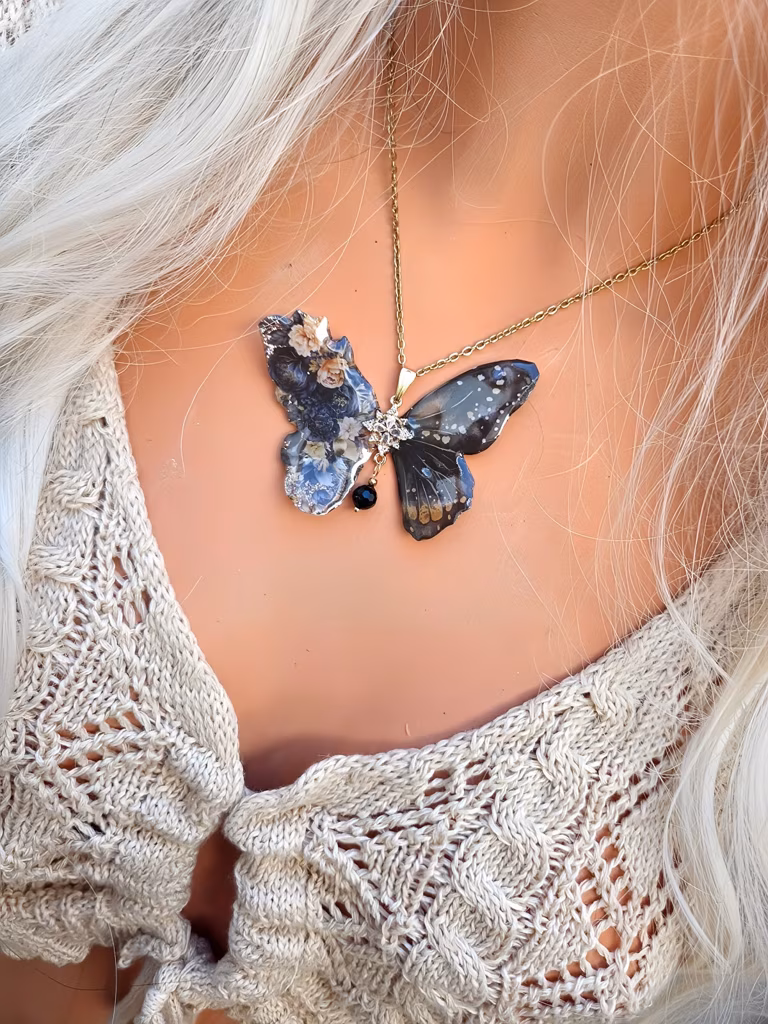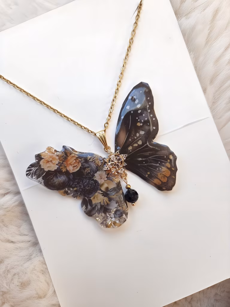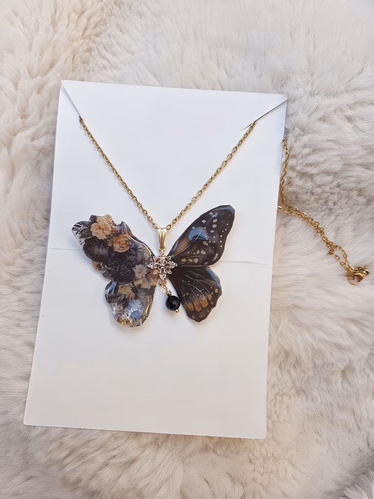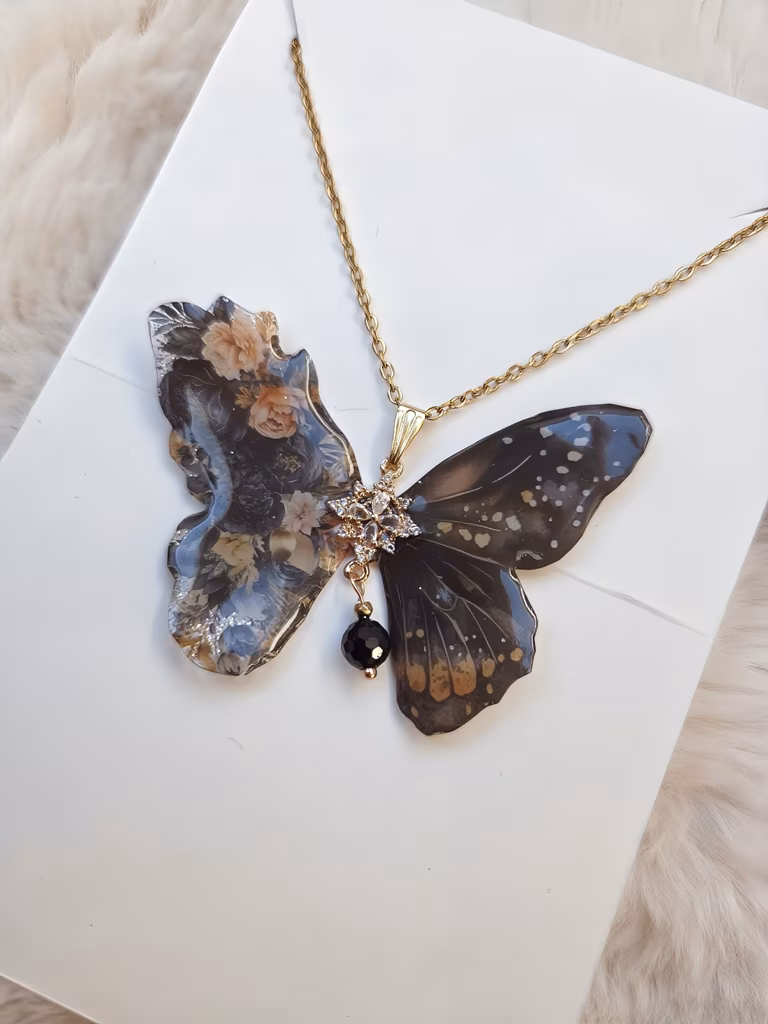 Łańcuszek: 45 cm stal chirurgiczna, środek motylka miedź pozłacana 18k złotem. Wymiar zawieszki: 6,6x4,5 cm, utwardzona żywica, kamień naturalny 6 mm.