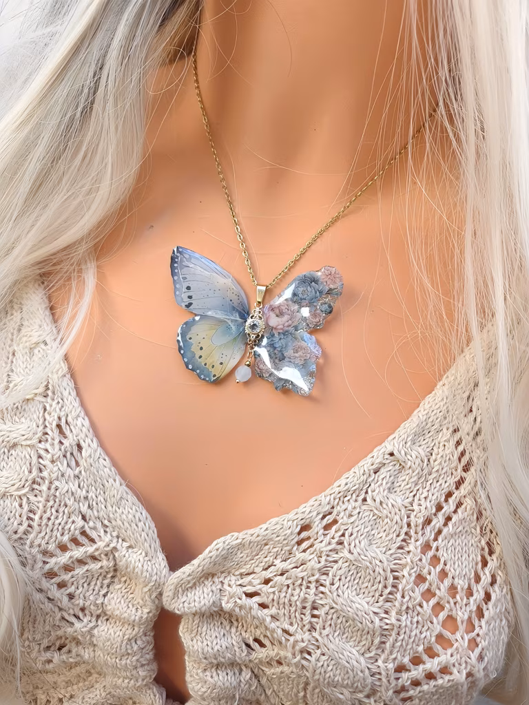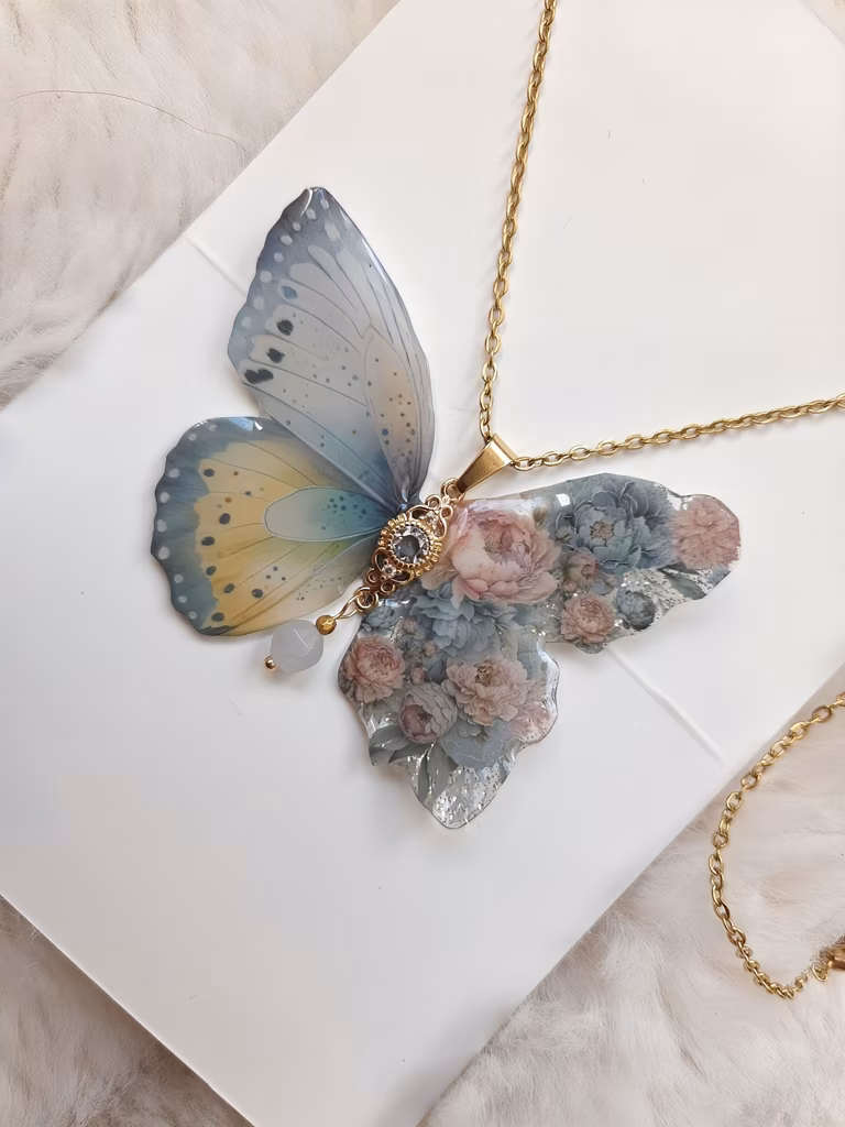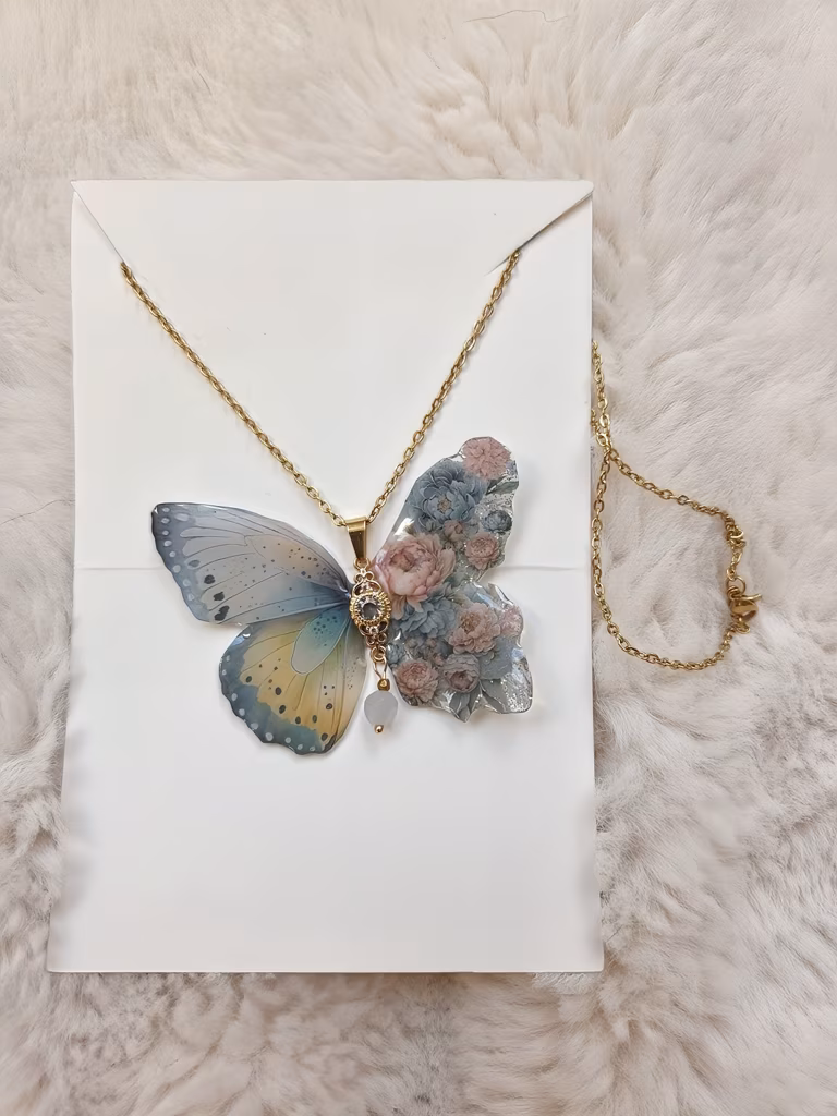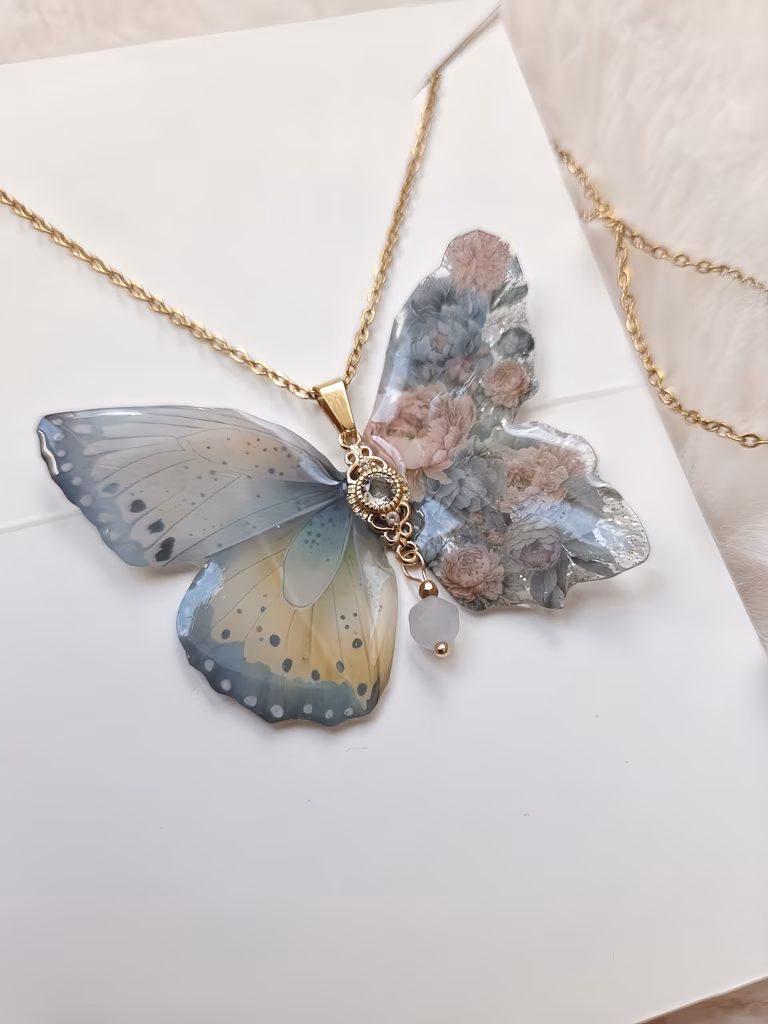 Łańcuszek: 45 cm stal chirurgiczna, środek motylka miedź pozłacana 18k złotem. Wymiar zawieszki: 6,5x6 cm, utwardzona żywica, kamień naturalny 6 mm.