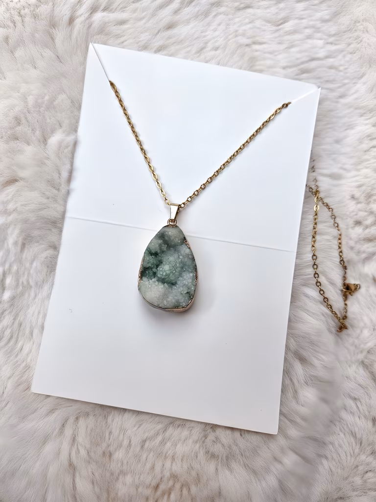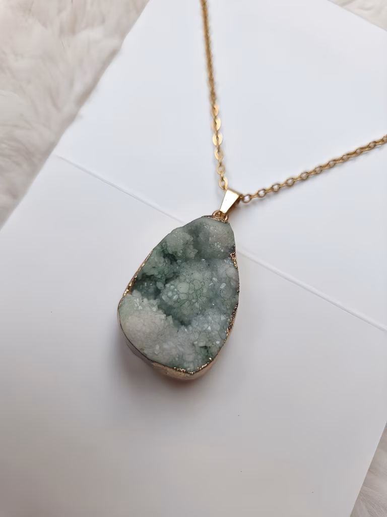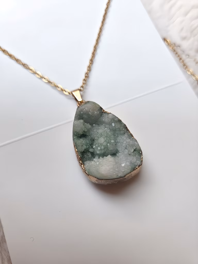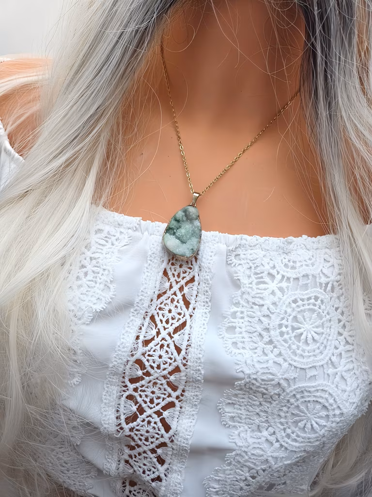 Miętowa geoda kwarcowa brzmi wyjątkowo – to rzadkie i bardzo świeże skojarzenie, łączące w sobie czystość bieli i kojącą zieleń.