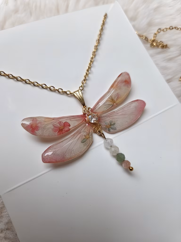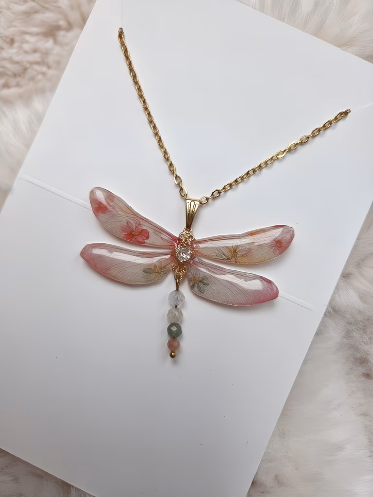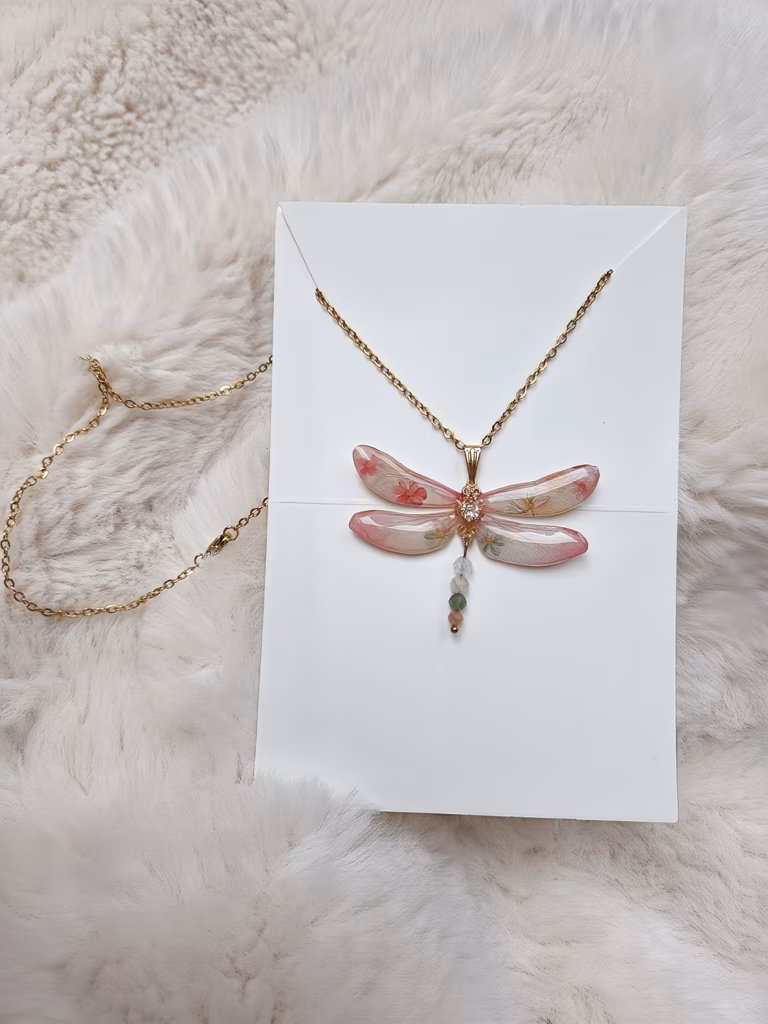 Oto wyjątkowa ważka, której skrzydła niosą nie jedno, lecz cztery magiczne kamienie — każdy z nich o innej energii, a razem tworzą harmonijny taniec światła, radości, miłości i ugruntowania. Przed Tobą Lumirae — świetlista posłanka obfitości duszy.
