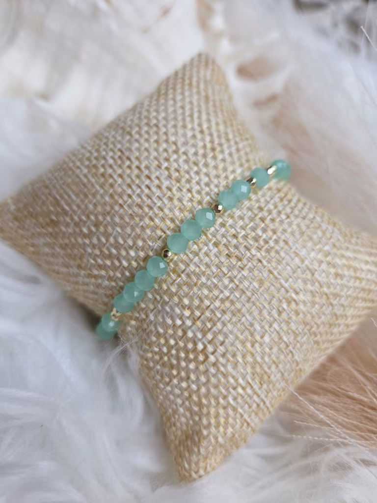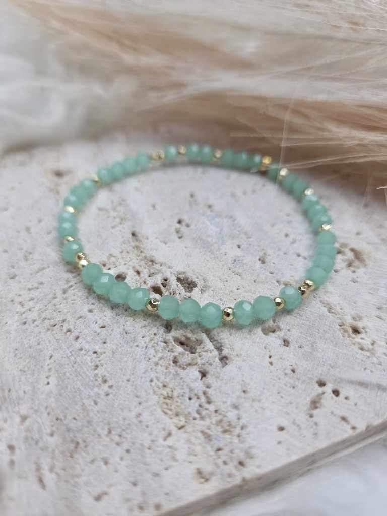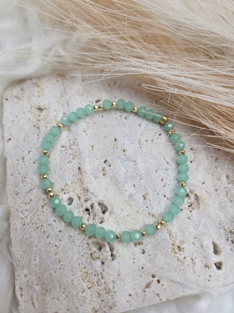 Miętowa Harmonia to bransoletka na gumce, która łączy w sobie lekkość koloru z eleganckim blaskiem detalu. Stworzona z fasetowanych, szklanych koralików w świeżym, miętowym odcieniu oraz pozłacanego hematytu, przyciąga spojrzenia subtelnym światłem i spokojną energią.