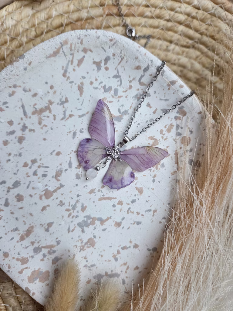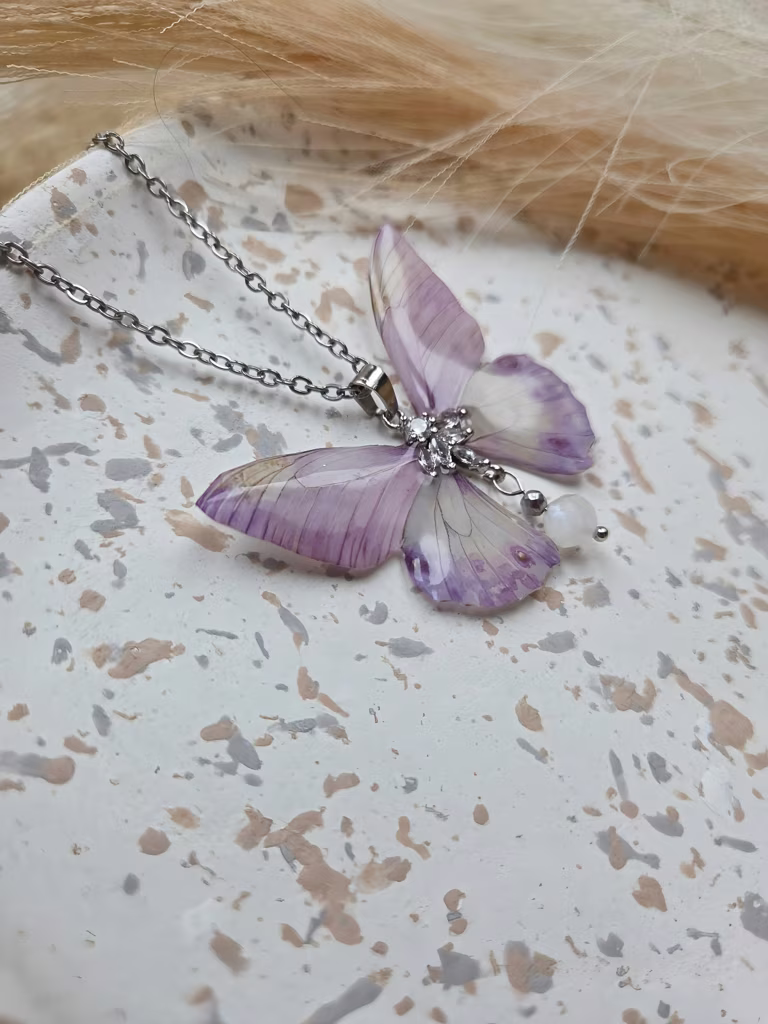 Moonvelis to motyl o skrzydłach w pastelowych odcieniach fioletu, delikatnych i subtelnych jak poranna mgła. Na jej sercu lśni kamień księżycowy — kamień: