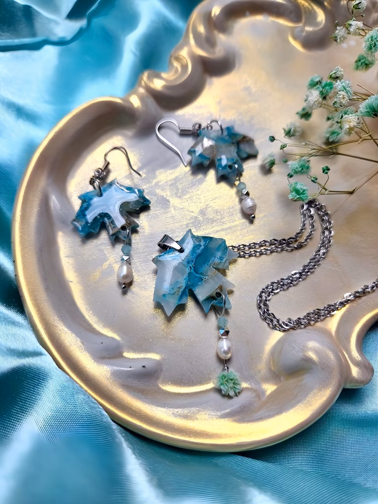 Komponując biżuterię staram się tak dobierać komponenty, by wyglądała niebanalnie. W trakcie procesu tworzenia wykorzystuję różne techniki, co pozwala na stworzenie wyjątkowych wzorów, których nie da się powtórzyć. Tak właśnie powstał piękny zestaw łączący ze sobą kamienie naturalne, glinę polimerową i żywicę UV.