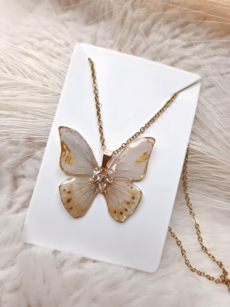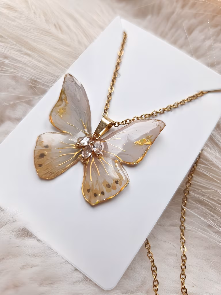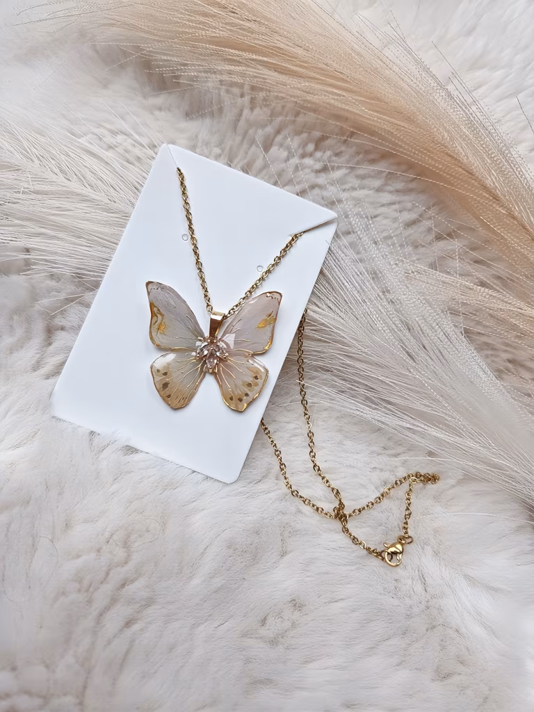 Łańcuszek: 45 cm stal chirurgiczna, środek motylka miedź posrebrzana. Wymiar zawieszki: 4x3,6 cm, utwardzona żywica. Kamień wielkości 6mm.