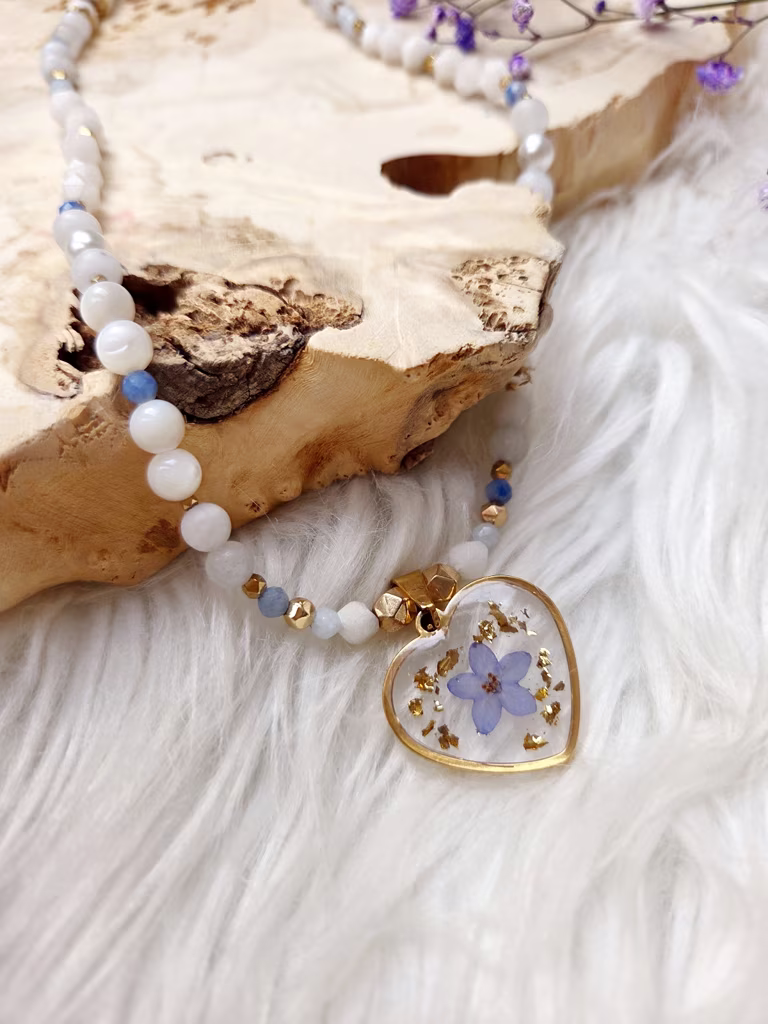 Sercem naszyjnika jest zawieszka – niezapominajka zatopiona w żywicy w kształcie serca. Ten drobny kwiat od wieków symbolizuje pamięć, czułość i więzi, które pozostają z nami na zawsze.