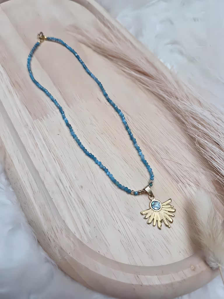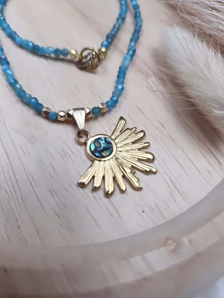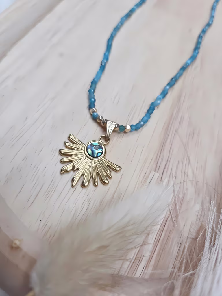 Pozwól sobie na podróż w głąb siebie z naszym wyjątkowym naszyjnikiem z: Apatytu – kamienia jasności i intuicji, który otwiera umysł i serce na duchowe inspiracje. Pozłacanego Hematytu – tarczy ochronnej, która równoważy energię i wzmacnia wewnętrzną moc. Muszli Abalone – z oceanicznym blaskiem, który koi duszę i przyciąga harmonię.