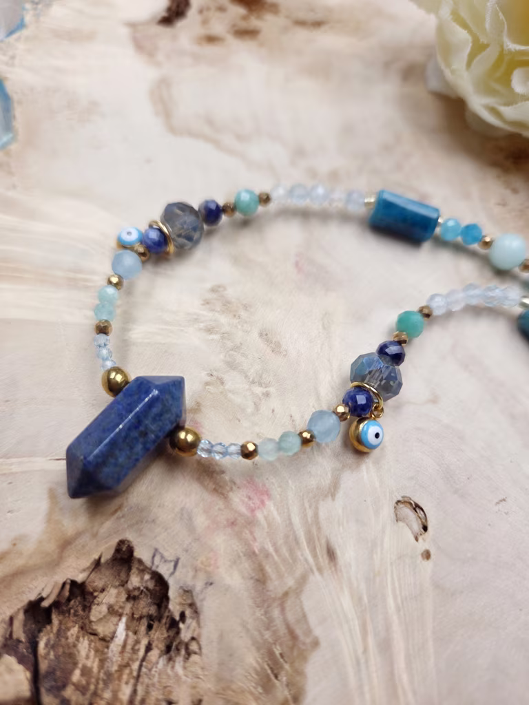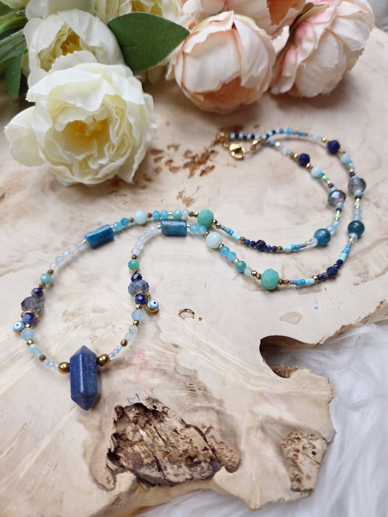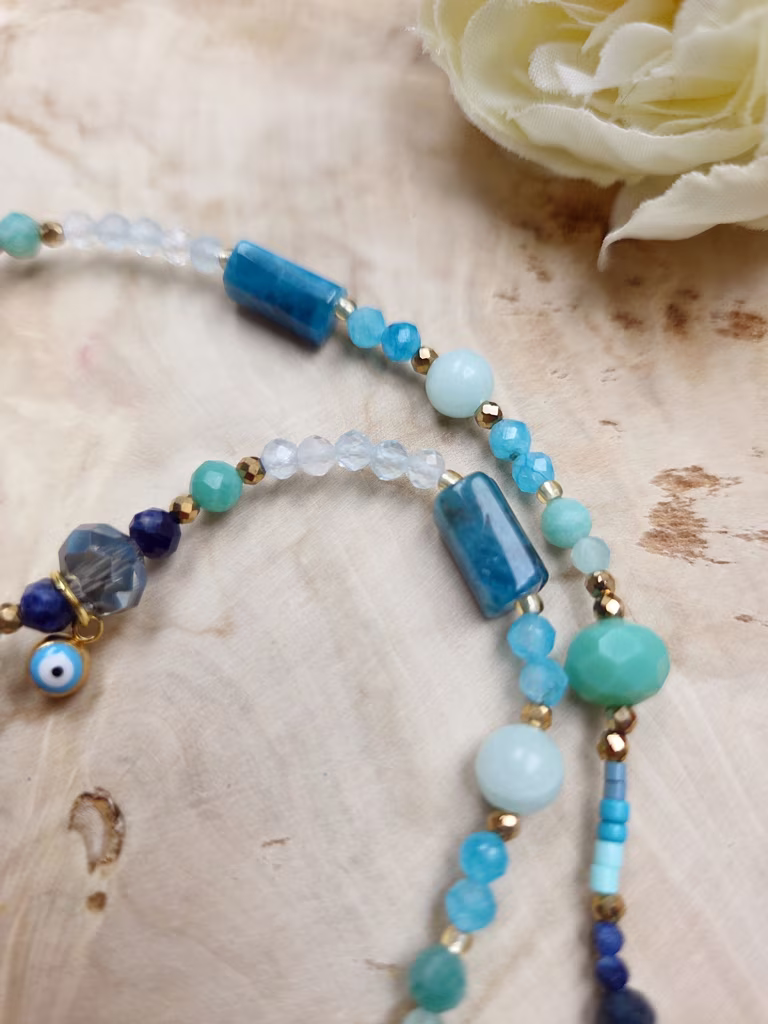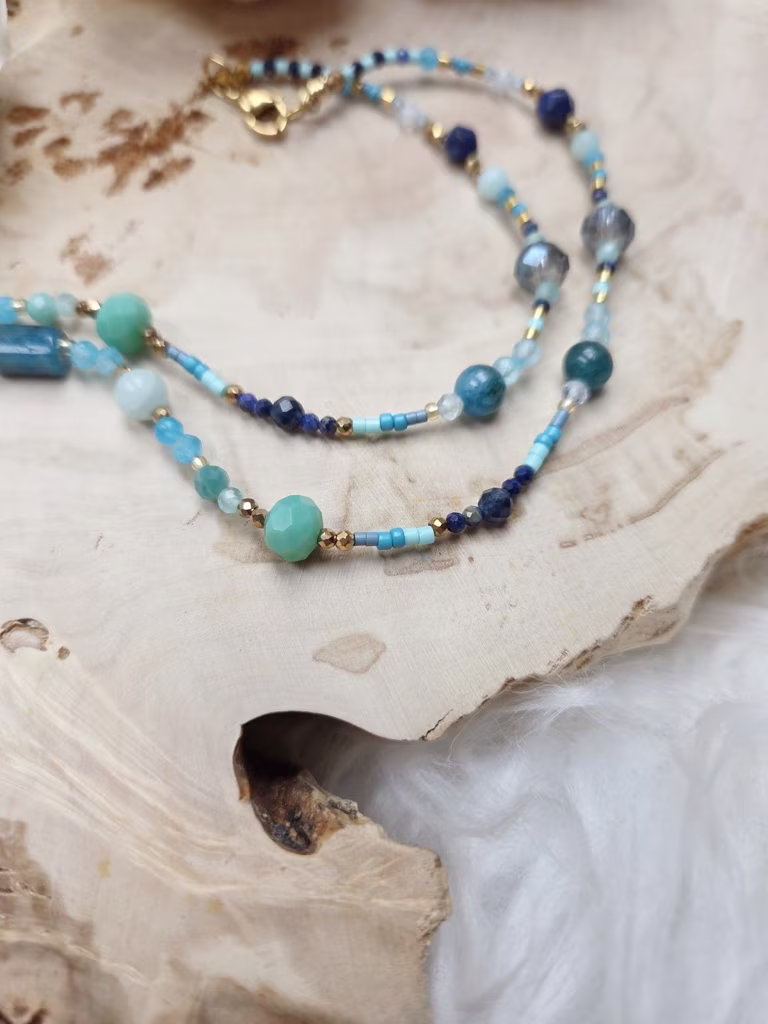Ten naszyjnik przypomina podróż w głąb spokojnego oceanu – od ciemnego granatu głębin, przez turkusowe fale, aż po jasny, krystaliczny błękit wody rozświetlonej słońcem. Jego barwy układają się w harmonijną paletę morskich odcieni: granatu, lazuru, turkusu i świeżej zieleni, tworząc kompozycję pełną spokoju, przestrzeni i naturalnego piękna.