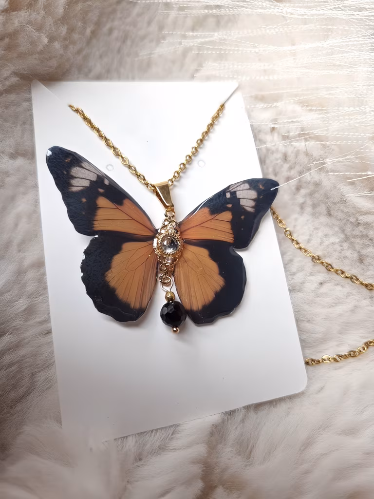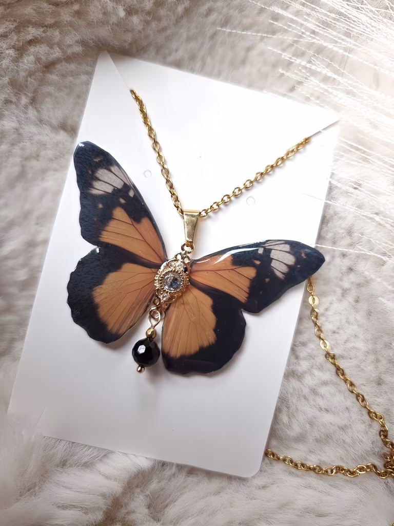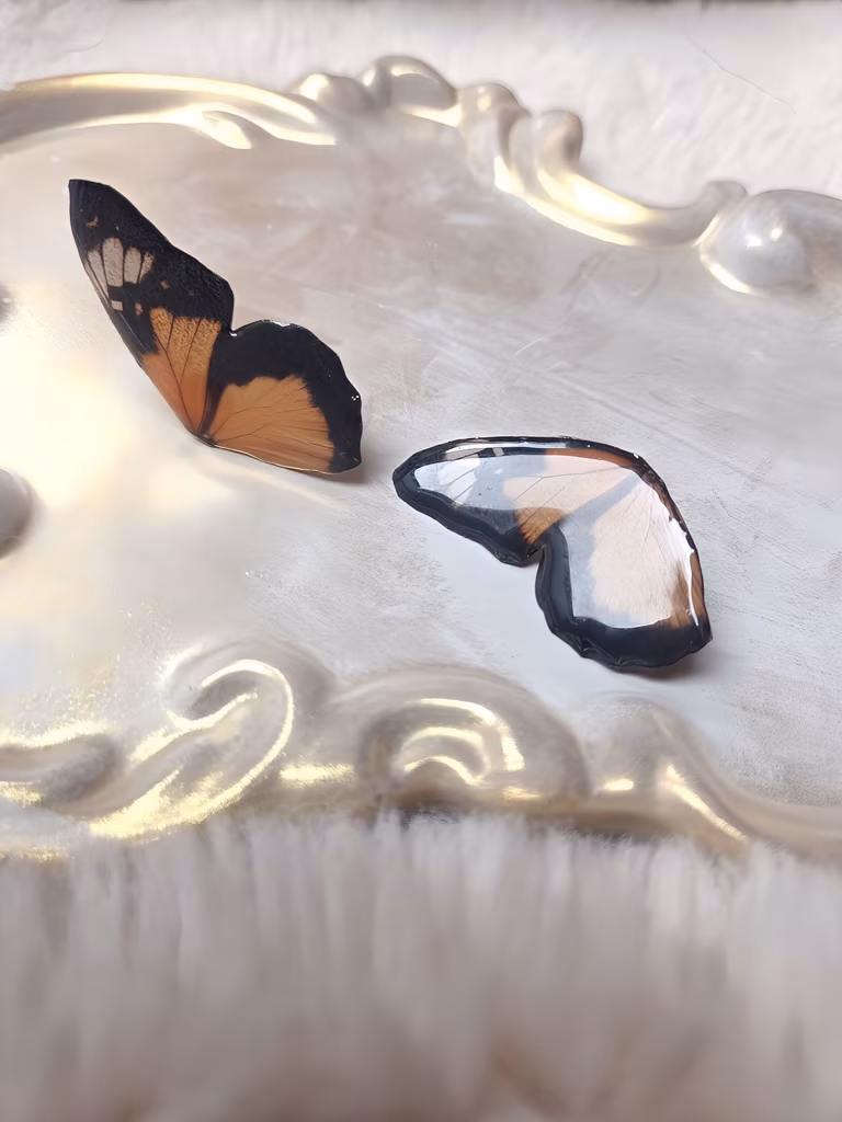 "Ogień Duszy” to komplet biżuterii stworzony dla tych, którzy noszą w sercu światło i wewnętrzną siłę. Kolczyki–motyle wykonane z żywicy w odcieniach ognistego brązu, głębokiej czerni i ciepłego beżu symbolizują przemianę – tak jak motyl rodzi się z cichej ciemności, tak człowiek odnajduje własną moc, kiedy ufa swojej drodze.