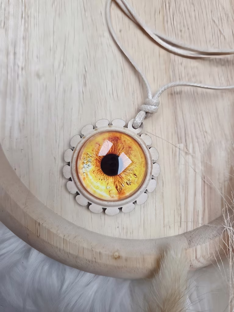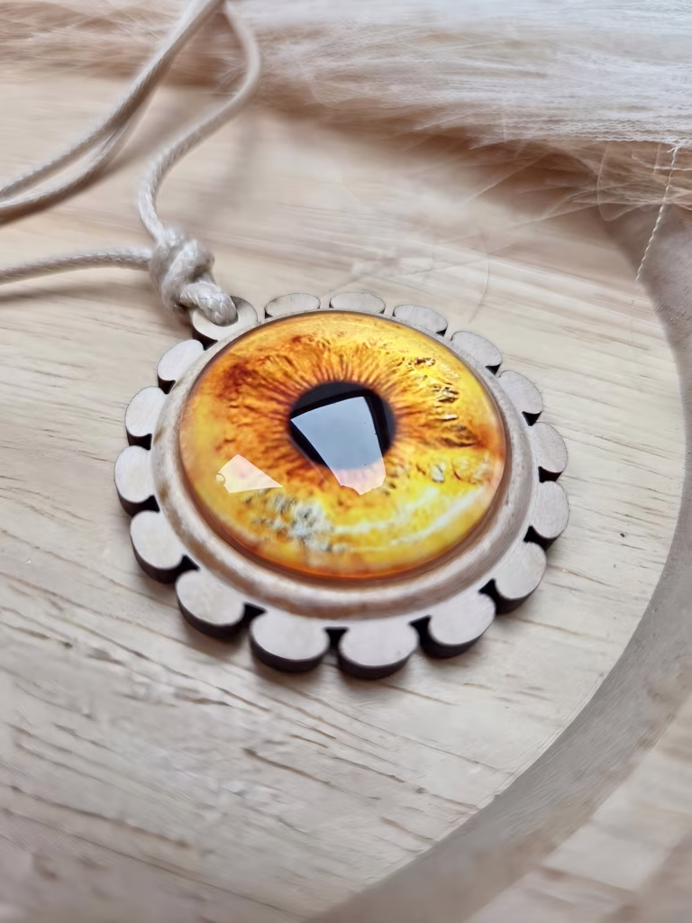 Oko Złotego Płomienia to wisiorek przedstawiający oko o tęczówce w odcieniach żółci i pomarańczu – jak rozżarzony żar lub wschodzące słońce. Kolory te przenikają się, tworząc wrażenie wewnętrznego ognia, czujności i życia. Oko symbolizuje świadomość, prawdę i ochronę, a złoty płomień – siłę, transformację i boską iskrę.