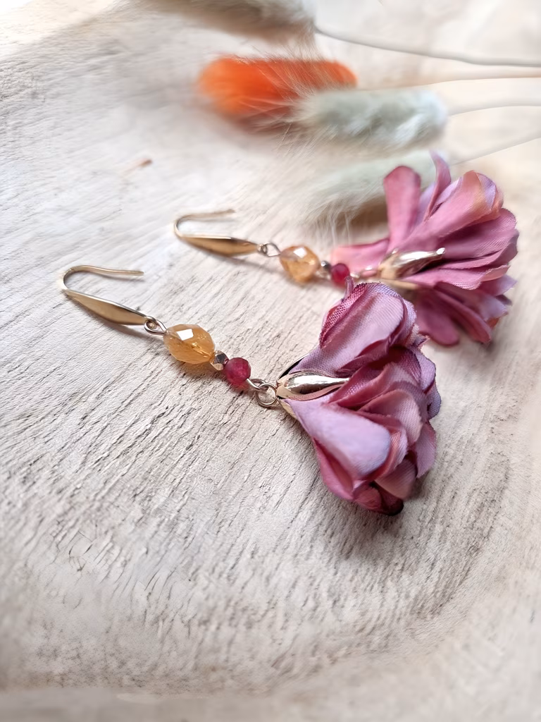 Kwieciste różowe kolczyki mają aurę delikatności, kobiecości i romantycznej energii. Róż symbolizuje miłość i subtelność, a motyw kwiatów – piękno natury, rozwój i lekkość.