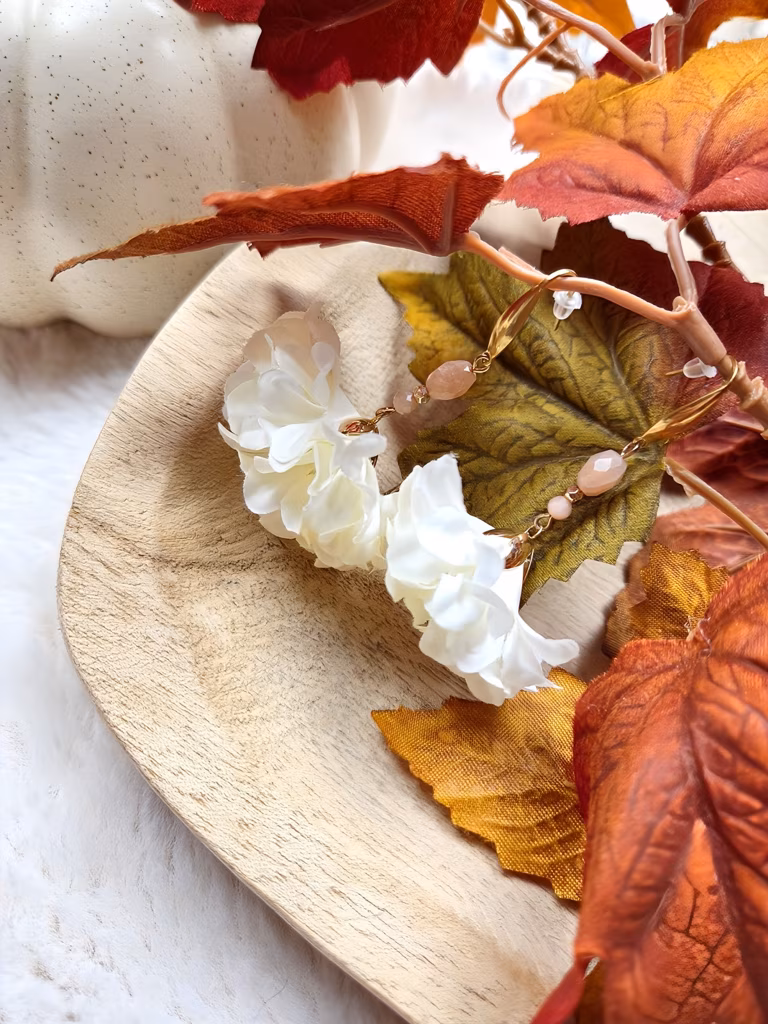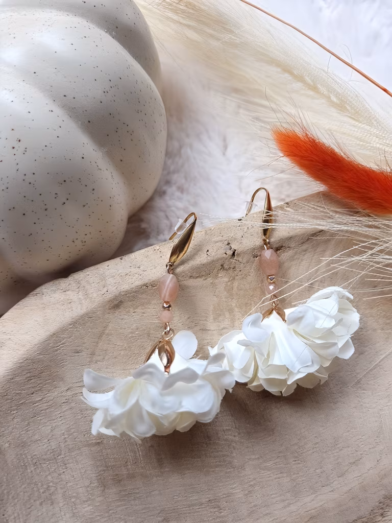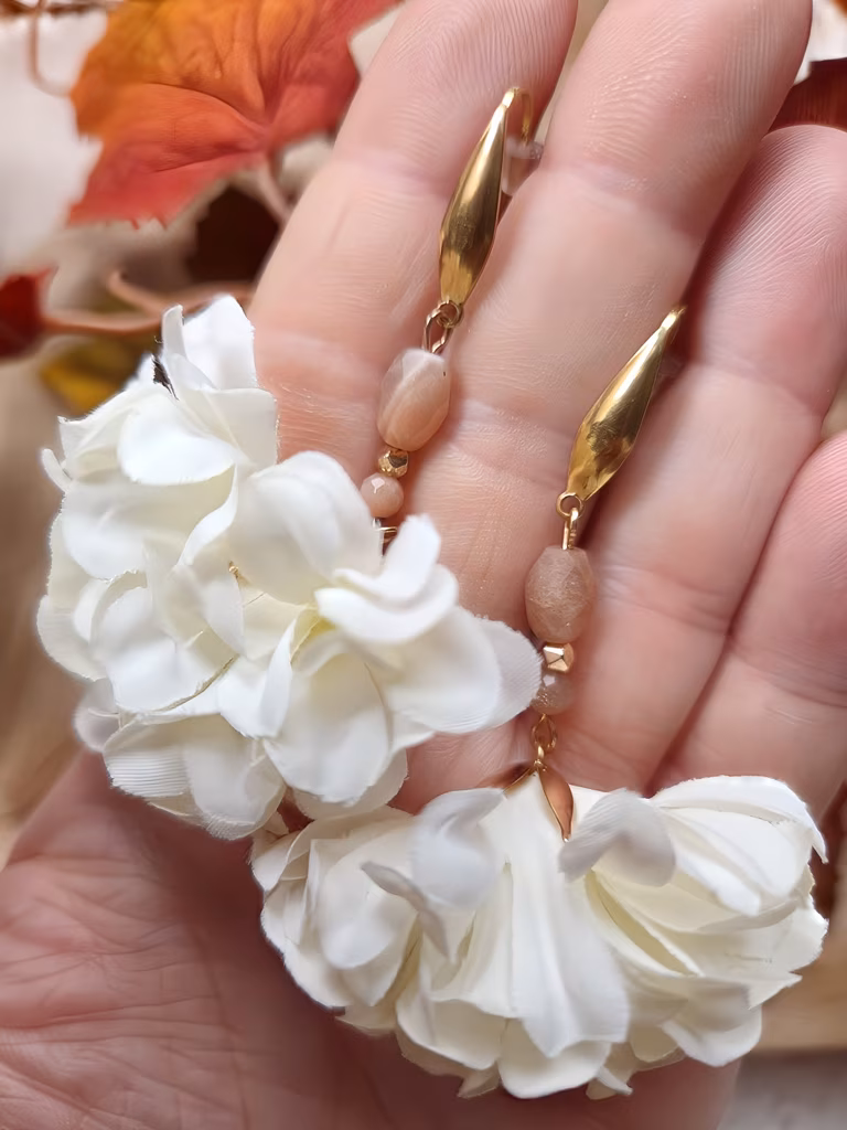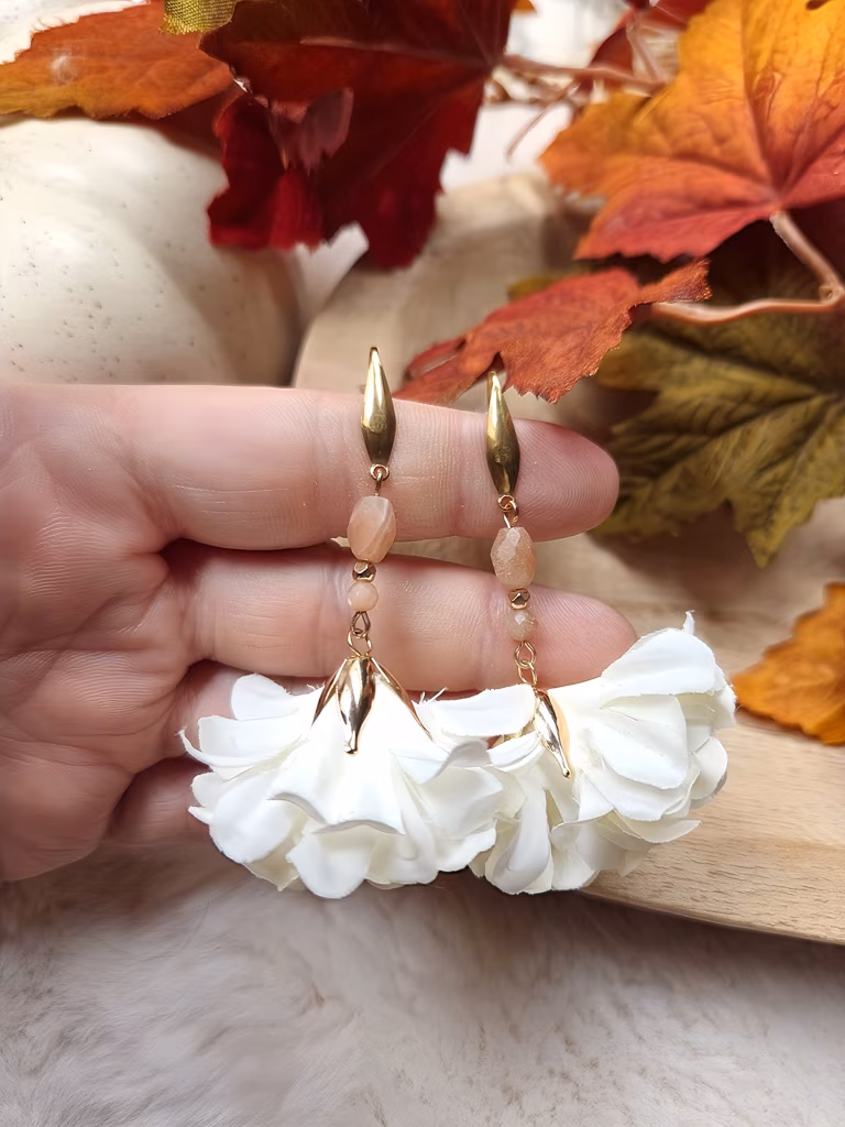 Kremowe, kwieciste kolczyki z kamieniem słonecznym mają aurę ciepła, radości i subtelnej elegancji Kwiatowy motyw dodaje lekkości i romantyzmu, a słoneczny kamień wnosi energię optymizmu i obfitości.