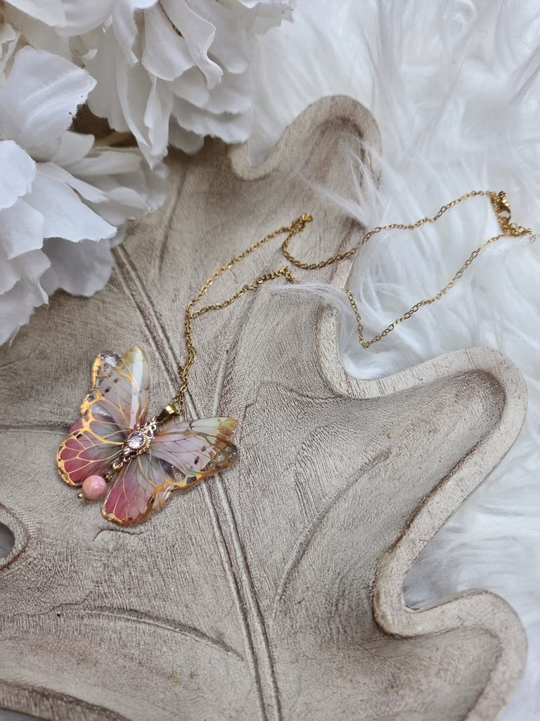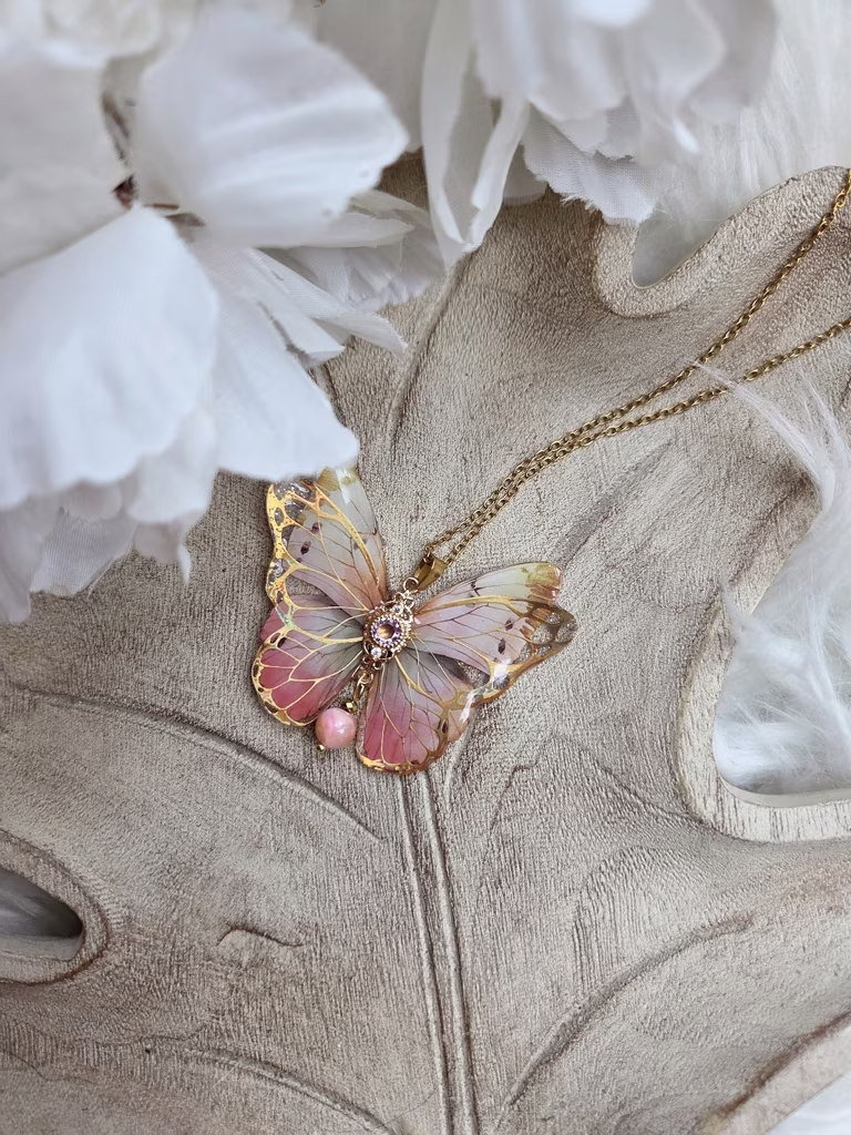 Szadela to wisiorek w kształcie motyla, utkany ze światła i ciszy poranka. Jego skrzydła migoczą odcieniami ciepłego złota, pudrowego różu niczym policzki muśnięte mrozem oraz kremowego beżu, który otula jak miękki szal. W sercu motyla spoczywa jadeit – kamień harmonii i spokojnej siły – oszlifowany tak, by łagodnie prowadził wzrok ku wnętrzu. Całość sprawia wrażenie talizmanu znalezionego w baśniowym ogrodzie, gdzie czas płynie wolniej, a intencje nabierają mocy.