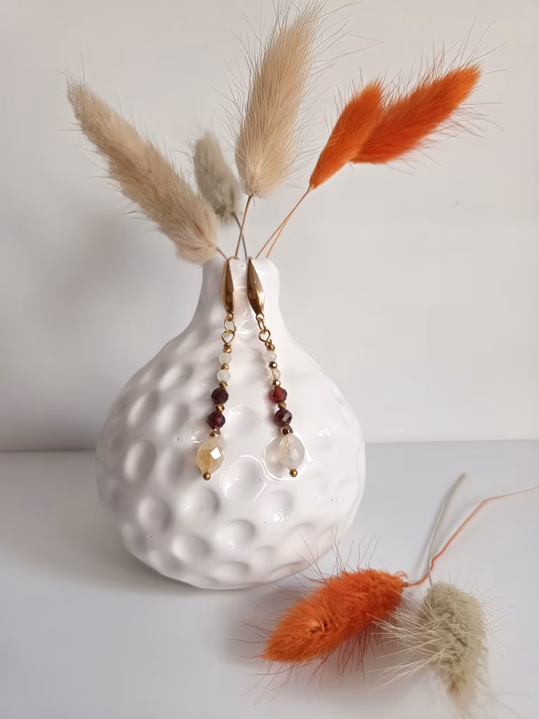 Kolczyki mają w sobie energię ognia i elegancji. Bordo to kolor pasji, głębi i szlachetności, a żółty symbolizuje radość, słońce i lekkość. To połączenie mocy i blasku.