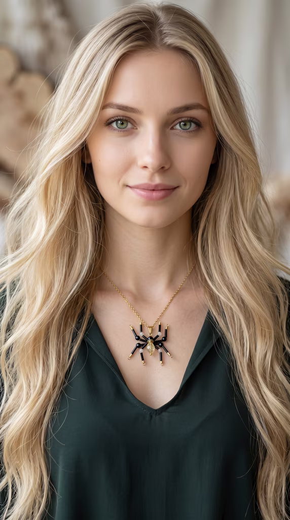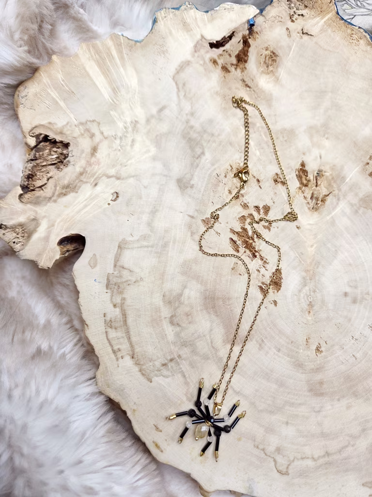 Ten niezwykły wisiorek przedstawia pająka – pradawnego Tkacza Losu, który według dawnych słowiańskich wierzeń snuje nici rzeczywistości i pilnuje porządku ukrytego w niewidzialnym świecie. Wykonany z precyzyjnych koralików Miyuki oraz kamieni naturalnych, łączy w sobie mrok ochrony i złoto wewnętrznego światła.