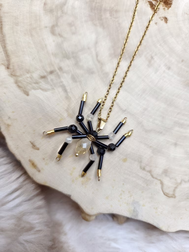 Magiczna symbolika: Pająk jest symbolem losu, kreacji i połączeń między wszystkimi wydarzeniami życia. Jego sieć to mapa przeznaczenia – delikatna, ale niezwykle silna. Czarny turmalin działa jak ochronna bariera, odcinając negatywne energie, natomiast cytryn otwiera przepływ obfitości, radości i odwagi do działania.