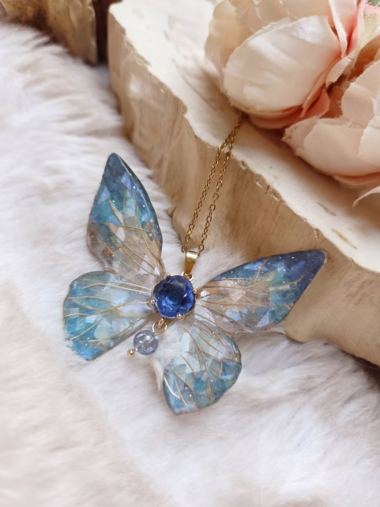 Wisiorek „Turkusowa Przemiana” niesie w sobie opowieść o delikatnej, lecz głębokiej zmianie – takiej, która rodzi się w ciszy serca. Motyl o skrzydłach przechodzących od turkusu do głębokiego granatu rozświetlony jest subtelnym, beżowym światłem, które rozlewa się od środka ku ich krawędziom niczym świt nad spokojną wodą. Złote żyłki oplatają skrzydła jak ścieżki przeznaczenia, a ich lekko brokatowy blask nadaje całości niemal eterycznej, żywej energii.