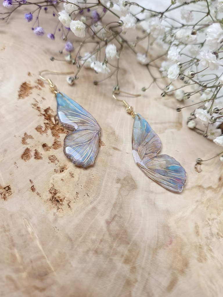 Zjawiskowe kolczyki inspirowane delikatnością motylich skrzydeł, wykonane z żywicy, zachwycają lekkością formy i subtelną grą kolorów. Przenikające się odcienie turkusu i jasnego beżu tworzą harmonijną, naturalną kompozycję, przywodzącą na myśl spokój natury i letnie niebo.