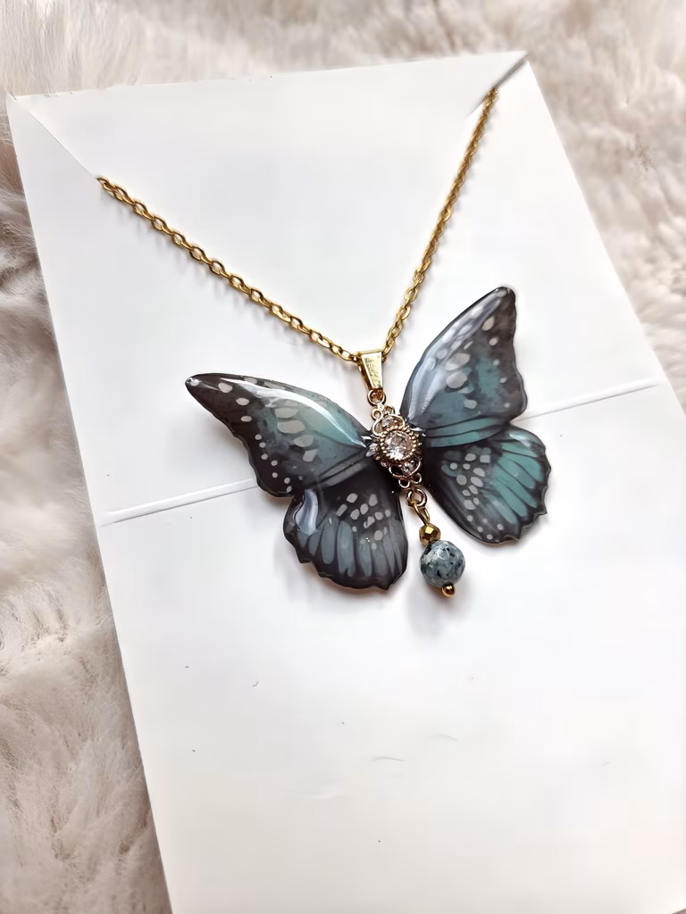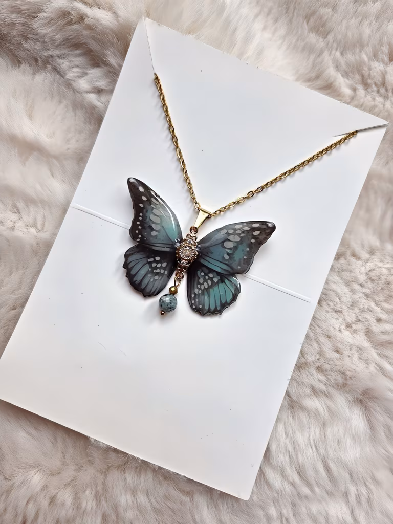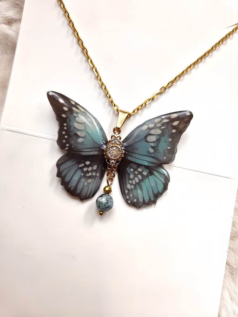 Łańcuszek: 45 cm stal chirurgiczna, środek motylka miedź pozłacana 18k złotem. Wymiar zawieszki: 5,2x4 cm, utwardzona żywią UV, kamień naturalny 6 mm.