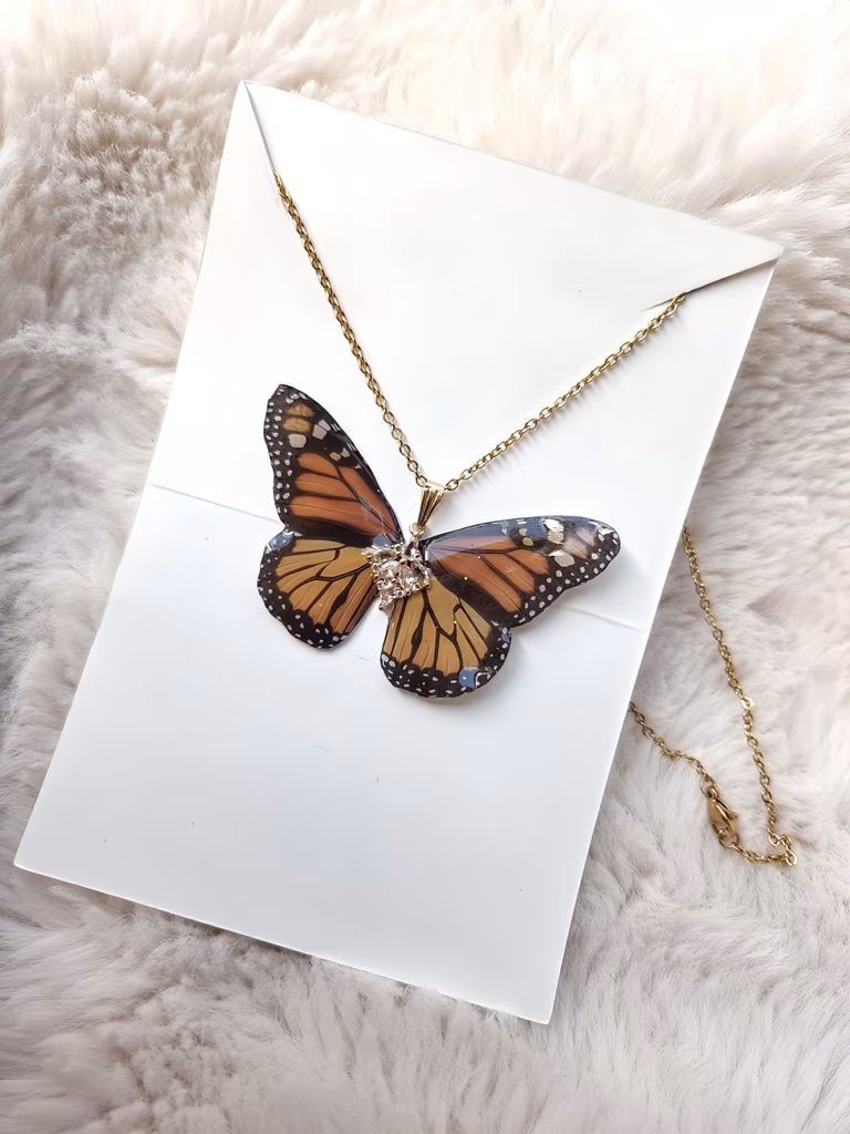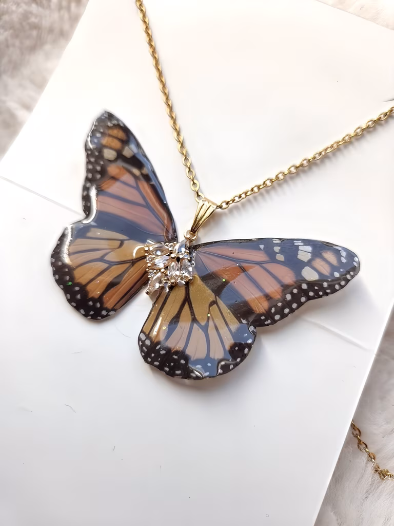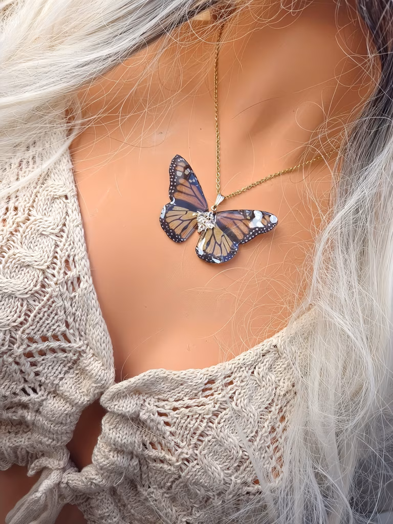 Łańcuszek: 45 cm stal chirurgiczna, środek motylka miedź pozłacana 18k złotem. Wymiar zawieszki: 6,5x4,3 cm, utwardzona żywica, kamień naturalny 6 mm.